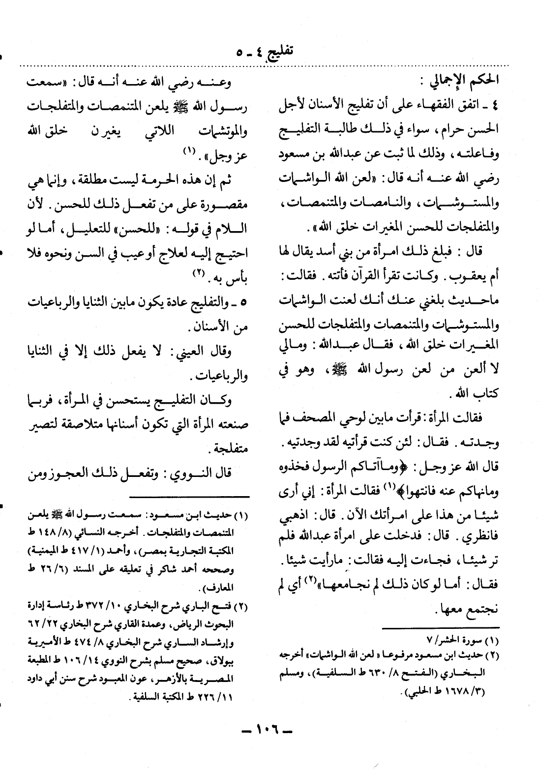 (1) حديث ابن مسعود: سمعت رسول الله صلى الله عليه وسلم يلعن المتنمصات والمتفلجات. أخرجه النسائي (8 / 148ط المكتبة التجارية بمصر) ، وأحمد (1 / 417ط الميمنية) وصححه أحمد شاكر في تعليقه على المسند (6 / 26 ط المعارف) .