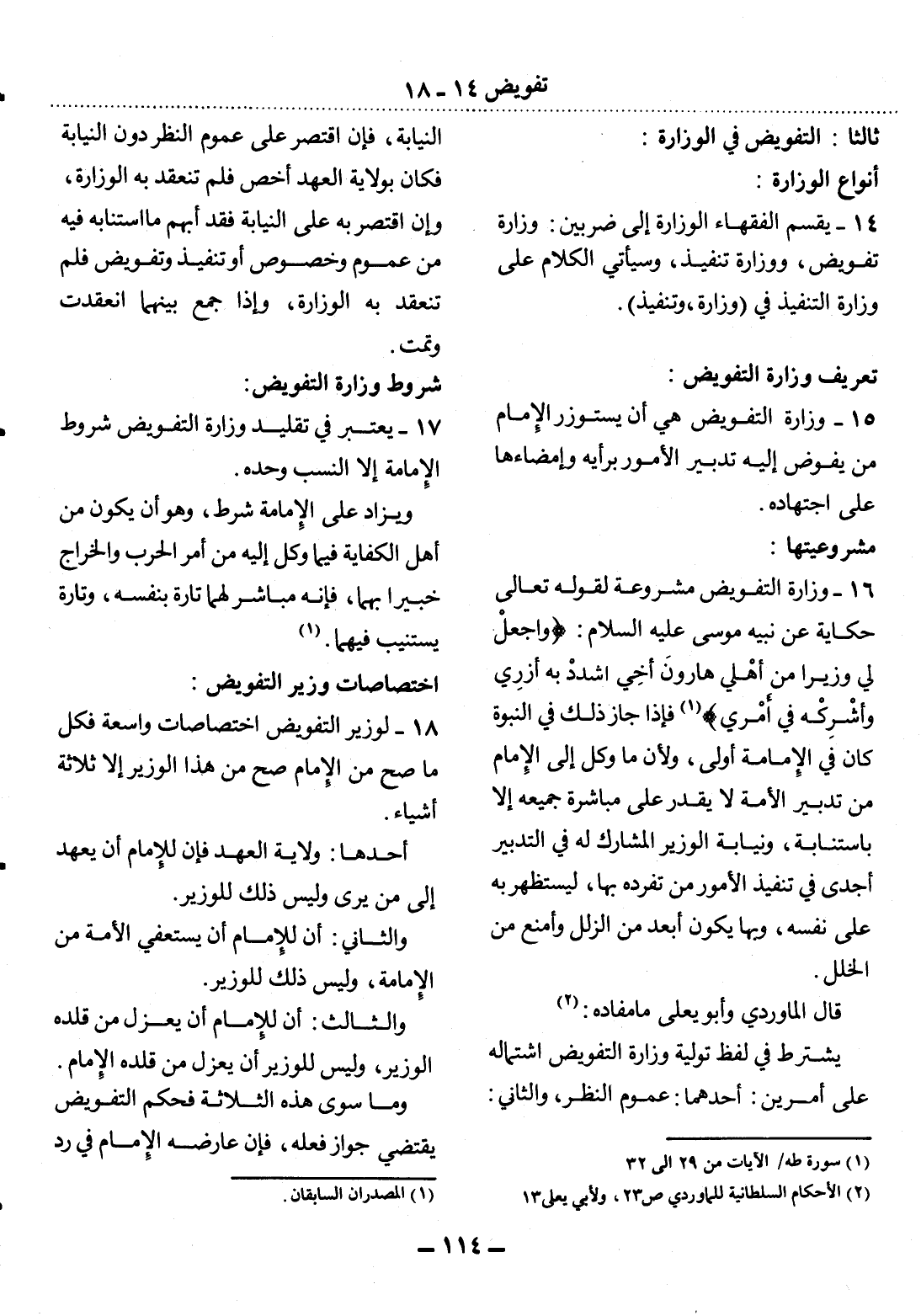 18 - لِوَزِيرِ التَّفْوِيضِ اخْتِصَاصَاتٌ وَاسِعَةٌ فَكُل مَا صَحَّ مِنَ الإِْمَامِ صَحَّ مِنْ هَذَا الْوَزِيرِ إِلاَّ ثَلاَثَةُ أَشْيَاءَ.