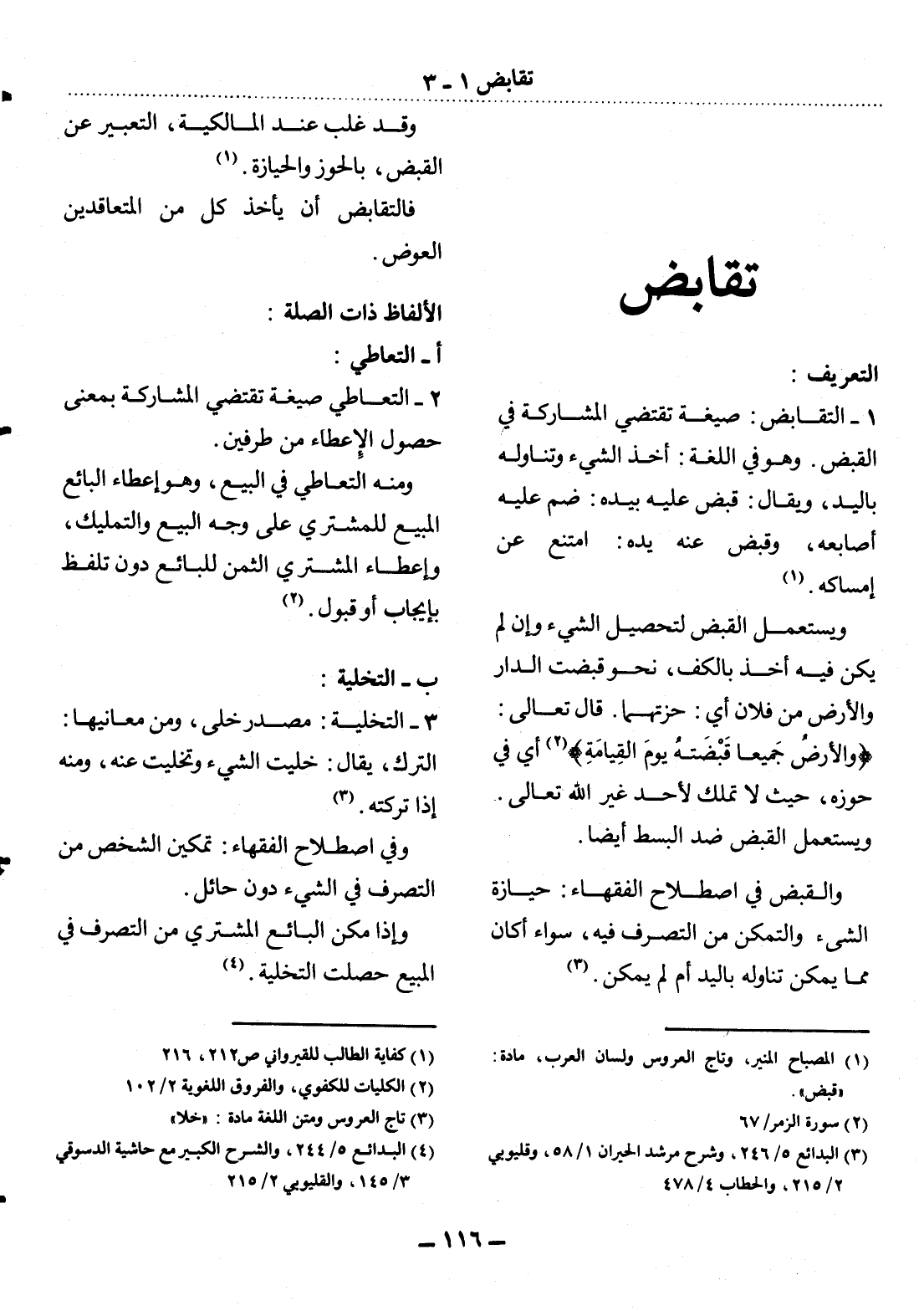 (1) المصباح المنير، وتاج العروس ولسان العرب، مادة: " قبض ".