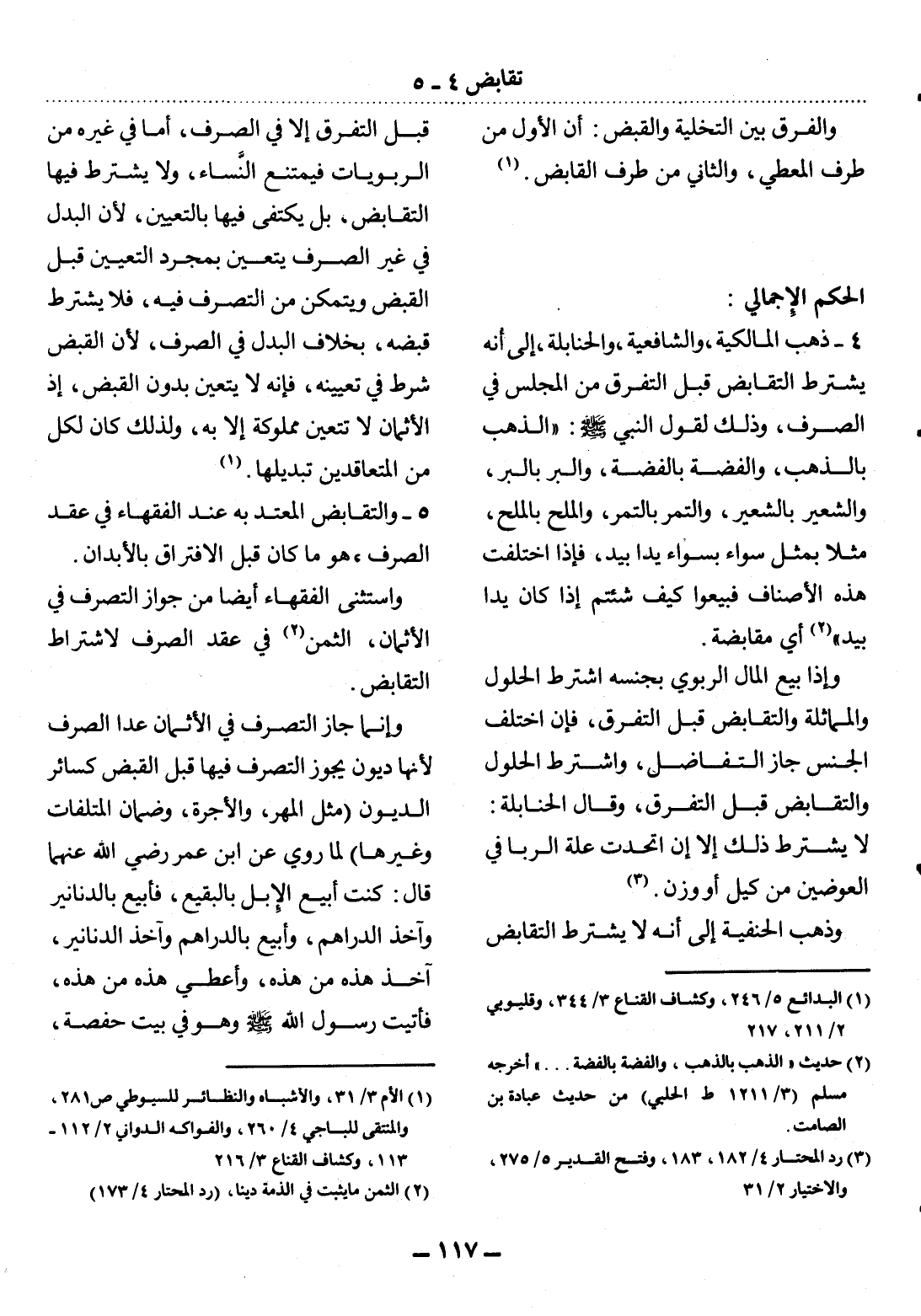 4 - ذَهَبَ الْمَالِكِيَّةُ، وَالشَّافِعِيَّةُ، وَالْحَنَابِلَةُ، إِلَى أَنَّهُ يُشْتَرَطُ التَّقَابُضُ قَبْل التَّفَرُّقِ مِنَ الْمَجْلِسِ فِي الصَّرْفِ، وَذَلِكَ لِقَوْل النَّبِيِّ صَلَّى اللَّهُ عَلَيْهِ وَسَلَّمَ: الذَّهَبُ بِالذَّهَبِ، وَالْفِضَّةُ بِالْفِضَّةِ، وَالْبُرُّ بِالْبُرِّ، وَالشَّعِيرُ بِالشَّعِيرِ، وَالتَّمْرُ بِالتَّمْرِ، وَالْمِلْحُ بِالْمِلْحِ، مِثْلاً بِمِثْلٍ سَوَاءً بِسَوَاءٍ يَدًا بِيَدٍ، فَإِذَا اخْتَلَفَتْ هَذِهِ الأَْصْنَافُ فَبِيعُوا كَيْفَ شِئْتُمْ إِذَا كَانَ يَدًا بِيَدٍ (2) أَيْ مُقَابَضَةً.