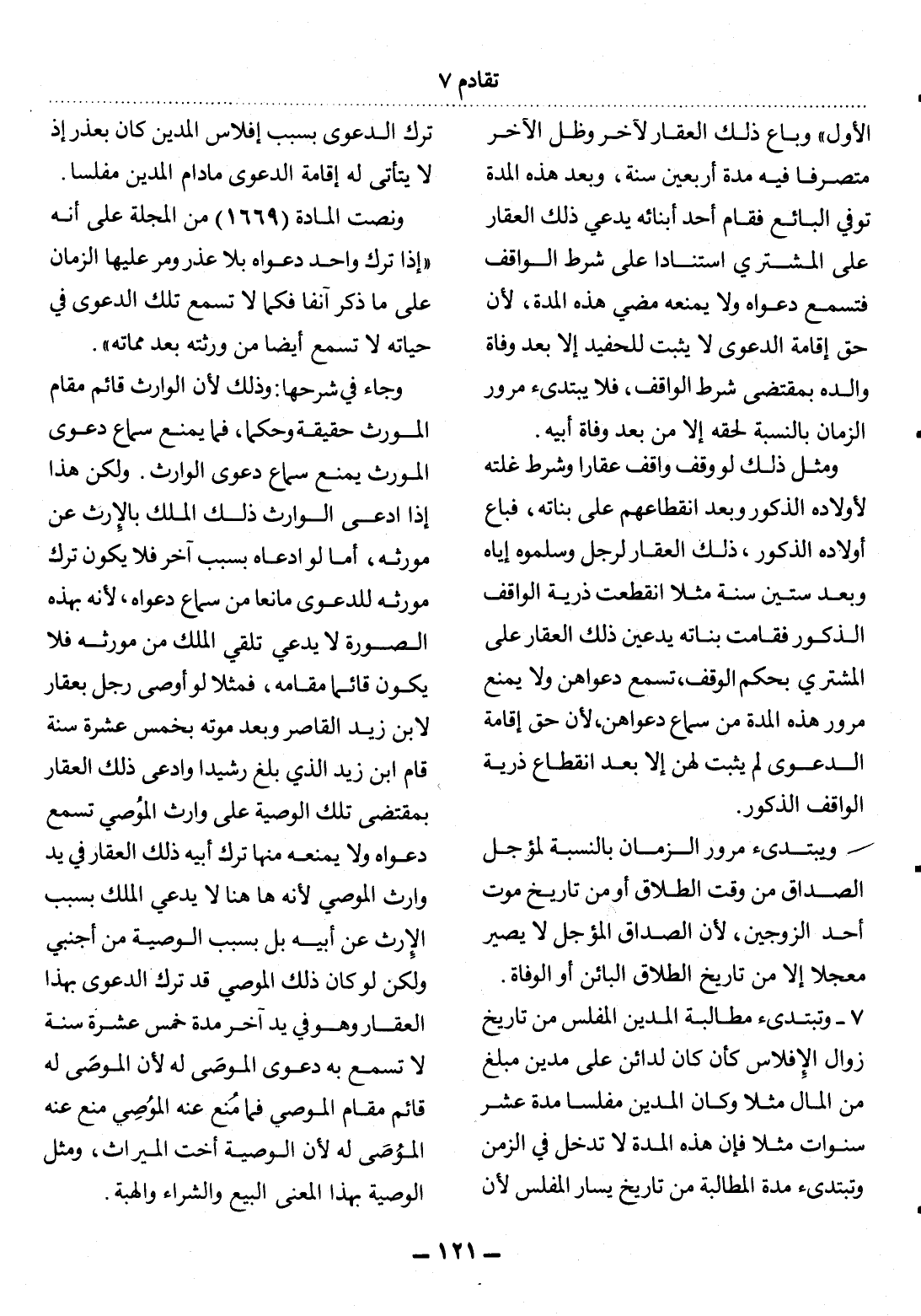 الأَْوَّل " وَبَاعَ ذَلِكَ الْعَقَارَ لآِخَرَ وَظَل الآْخَرُ مُتَصَرِّفًا فِيهِ مُدَّةَ أَرْبَعِينَ سَنَةً، وَبَعْدَ هَذِهِ الْمُدَّةِ تُوُفِّيَ الْبَائِعُ فَقَامَ أَحَدُ أَبْنَائِهِ يَدَّعِي ذَلِكَ الْعَقَارَ عَلَى الْمُشْتَرِي اسْتِنَادًا عَلَى شَرْطِ الْوَاقِفِ فَتُسْمَعُ دَعْوَاهُ وَلاَ يَمْنَعُهُ مُضِيُّ هَذِهِ الْمُدَّةِ، لأَِنَّ حَقَّ إِقَامَةِ الدَّعْوَى لاَ يَثْبُتُ لِلْحَفِيدِ إِلاَّ بَعْدَ وَفَاةِ وَالِدِهِ بِمُقْتَضَى شَرْطِ الْوَاقِفِ، فَلاَ يَبْتَدِئُ مُرُورُ الزَّمَانِ بِالنِّسْبَةِ لِحَقِّهِ إِلاَّ مِنْ بَعْدِ وَفَاةِ أَبِيهِ.