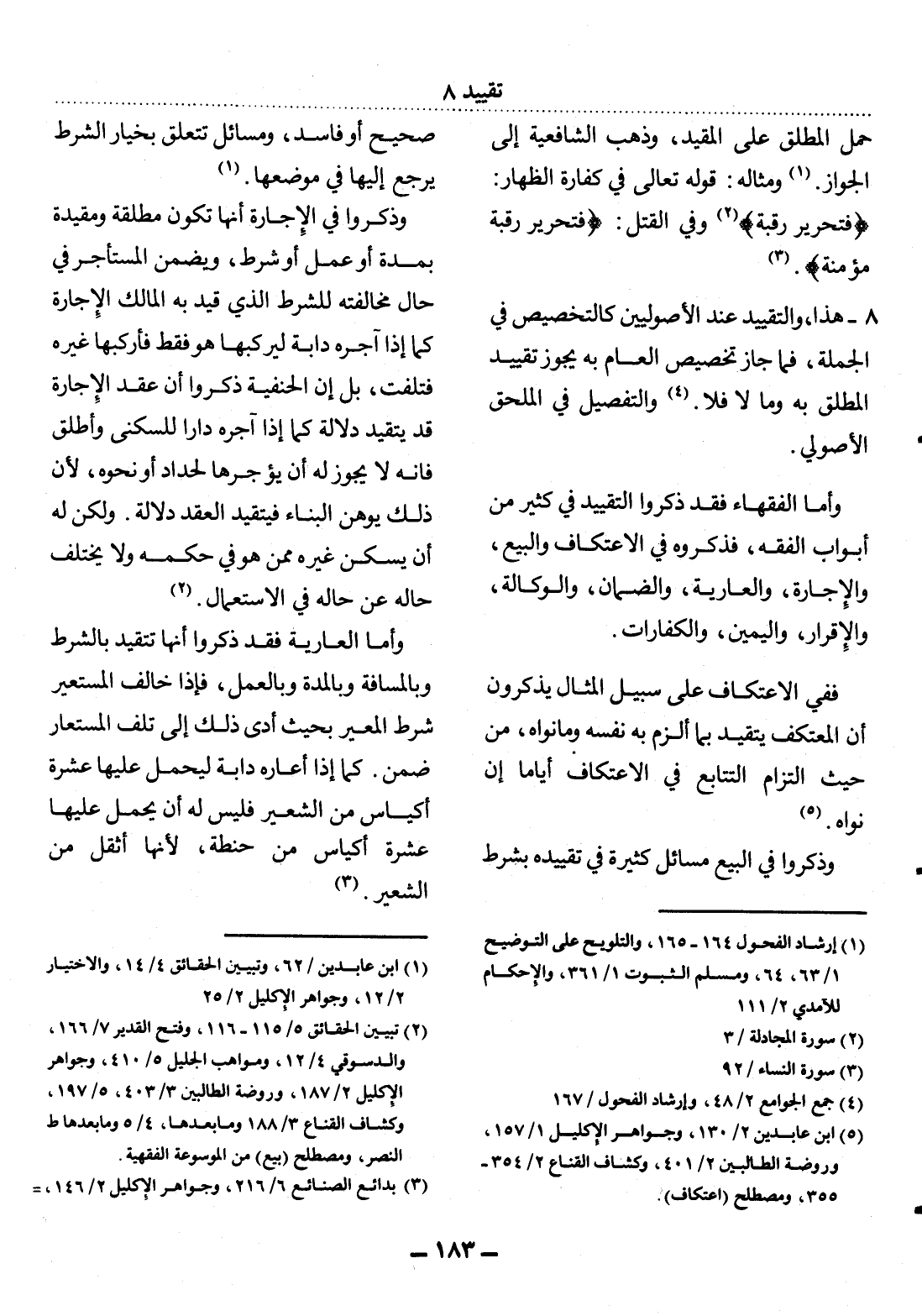 وَأَمَّا الْفُقَهَاءُ فَقَدْ ذَكَرُوا التَّقْيِيدَ فِي كَثِيرٍ مِنْ أَبْوَابِ الْفِقْهِ، فَذَكَرُوهُ فِي الاِعْتِكَافِ وَالْبَيْعِ، وَالإِْجَارَةِ، وَالْعَارِيَّةِ، وَالضَّمَانِ، وَالْوَكَالَةِ، وَالإِْقْرَارِ، وَالْيَمِينِ، وَالْكَفَّارَاتِ.