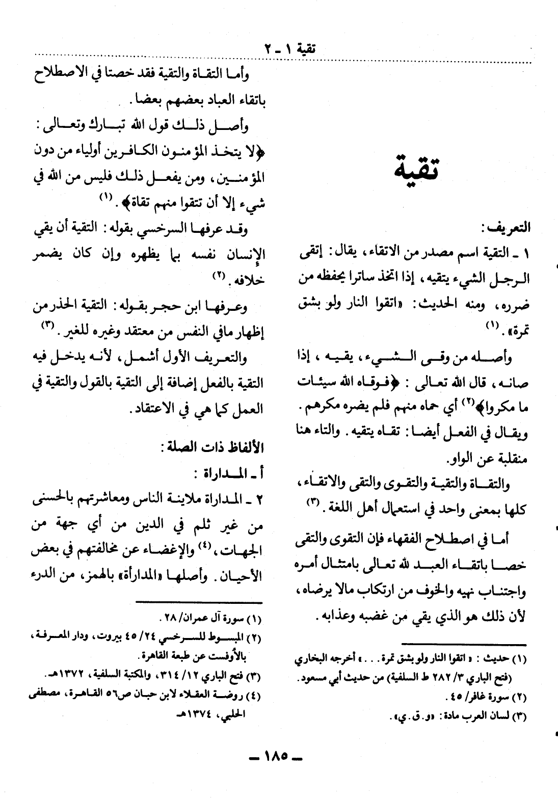 وَأَصْل ذَلِكَ قَوْل اللَّهِ تَبَارَكَ وَتَعَالَى: {لاَ يَتَّخِذِ الْمُؤْمِنُونَ الْكَافِرِينَ أَوْلِيَاءَ مِنْ دُونِ الْمُؤْمِنِينَ وَمَنْ يَفْعَل ذَلِكَ فَلَيْسَ مِنَ اللَّهِ فِي شَيْءٍ إِلاَّ أَنْ تَتَّقُوا مِنْهُمْ تُقَاةً} (1) .