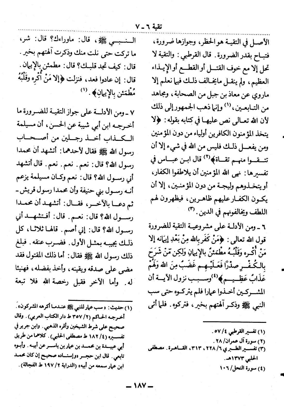 6 - وَمِنَ الأَْدِلَّةِ عَلَى مَشْرُوعِيَّةِ التَّقِيَّةِ لِلضَّرُورَةِ قَوْل اللَّهِ تَعَالَى: {مَنْ كَفَرَ بِاَللَّهِ مِنْ بَعْدِ إِيمَانِهِ إِلاَّ مَنْ أُكْرِهَ وَقَلْبُهُ مُطْمَئِنٌّ بِالإِْيمَانِ وَلَكِنْ مَنْ شَرَحَ بِالْكُفْرِ صَدْرًا فَعَلَيْهِمْ غَضَبٌ مِنَ اللَّهِ وَلَهُمْ عَذَابٌ عَظِيمٌ} (4) وَسَبَبُ نُزُول الآْيَةِ أَنَّ الْمُشْرِكِينَ أَخَذُوا عَمَّارًا فَلَمْ يَتْرُكُوهُ حَتَّى سَبَّ النَّبِيَّ صَلَّى اللَّهُ عَلَيْهِ وَسَلَّمَ وَذَكَرَ آلِهَتَهُمْ بِخَيْرٍ، فَتَرَكُوهُ. فَلَمَّا أَتَى