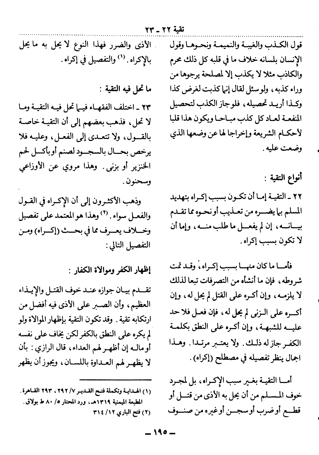 22 - التَّقِيَّةُ إِمَّا أَنْ تَكُونَ بِسَبَبِ إِكْرَاهٍ بِتَهْدِيدِ الْمُسْلِمِ بِمَا يَضُرُّهُ مِنْ تَعْذِيبٍ أَوْ نَحْوِهِ مِمَّا تَقَدَّمَ بَيَانُهُ، إِنْ لَمْ يَفْعَل مَا طُلِبَ مِنْهُ، وَإِمَّا أَنْ لاَ تَكُونَ بِسَبَبِ إِكْرَاهٍ.
