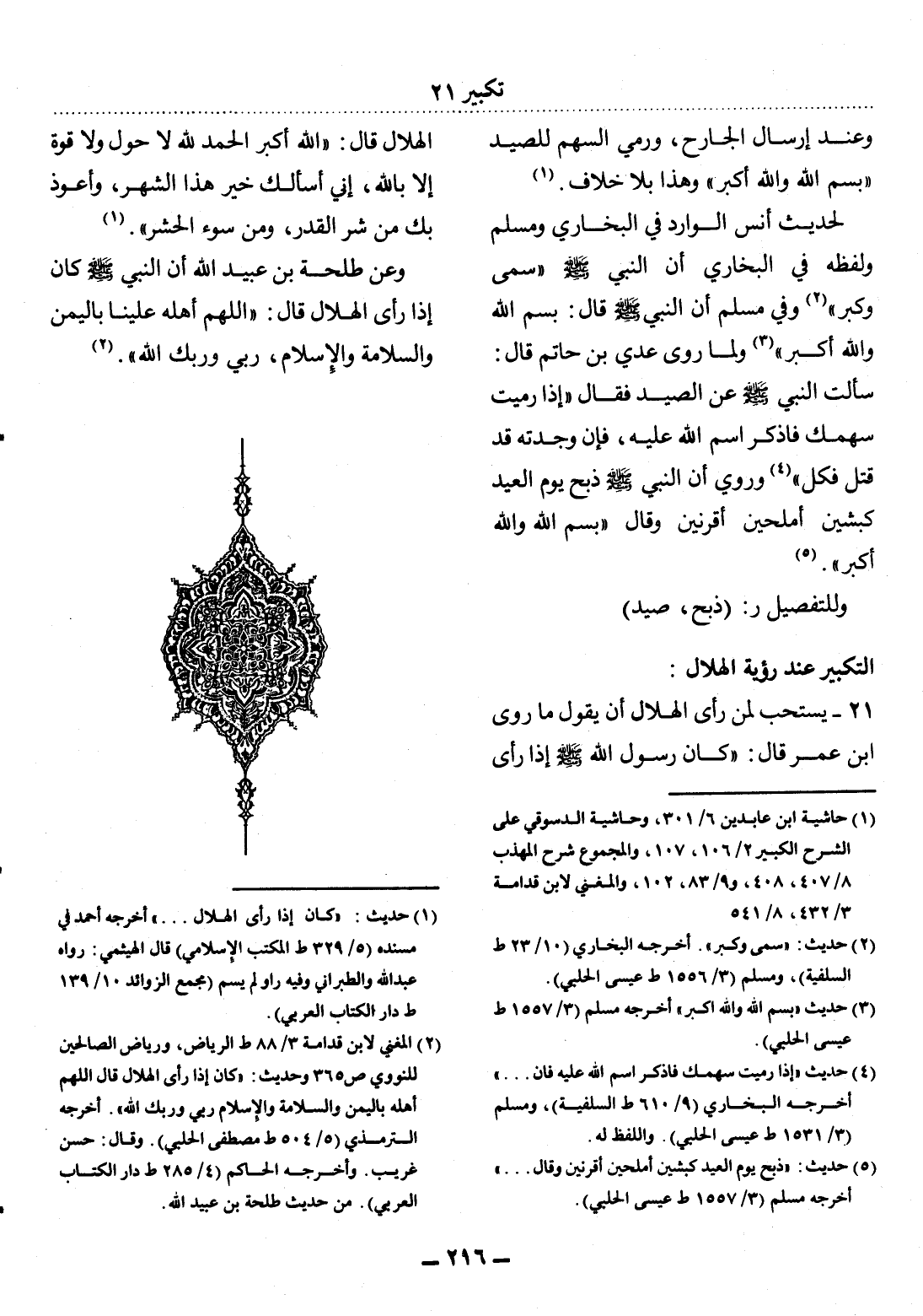 21 - يُسْتَحَبُّ لِمَنْ رَأَى الْهِلاَل أَنْ يَقُول مَا رَوَى ابْنُ عُمَرَ قَال: كَانَ رَسُول اللَّهِ صَلَّى اللَّهُ عَلَيْهِ وَسَلَّمَ إِذَا رَأَى