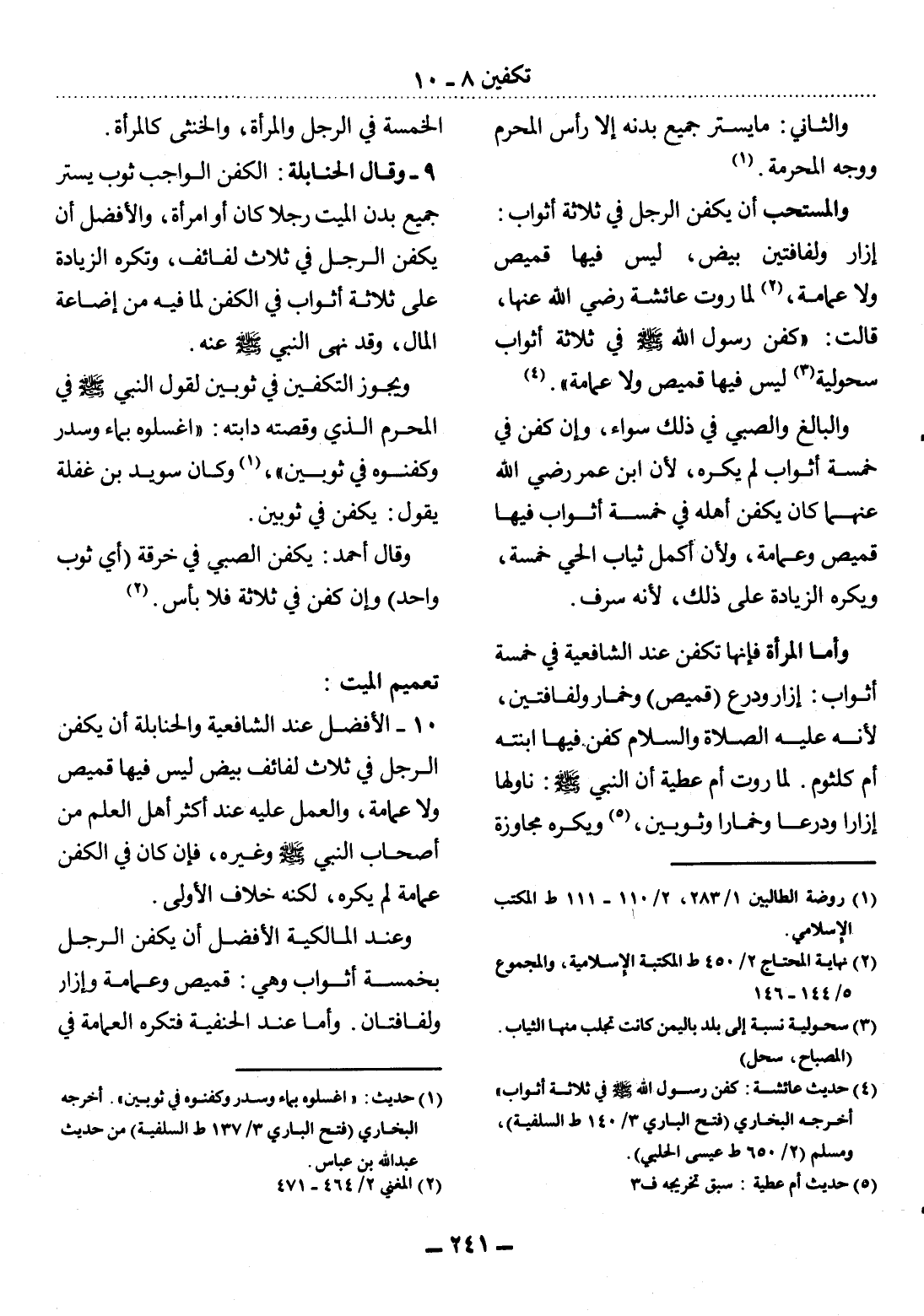(4) حديث عائشة: " كفن رسول الله صلى الله عليه وسلم في ثلاثة أثواب " أخرجه البخاري (فتح الباري 3 / 140 ط السلفية) ، ومسلم (2 / 650 ط عيسى الحلبي) .