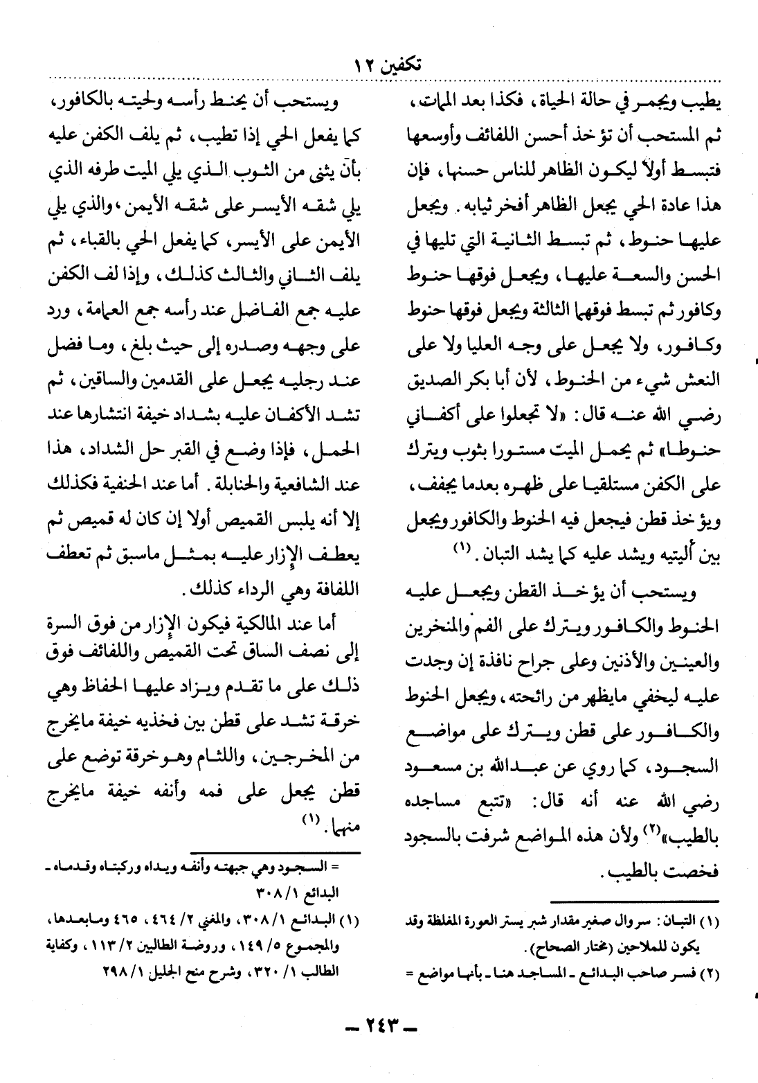 (2) فسر صاحب البدائع - المساجد هنا - بأنها مواضع السجود وهي جبهته وأنفه ويداه وركبتاه وقدماه - البدائع 1 / 308.