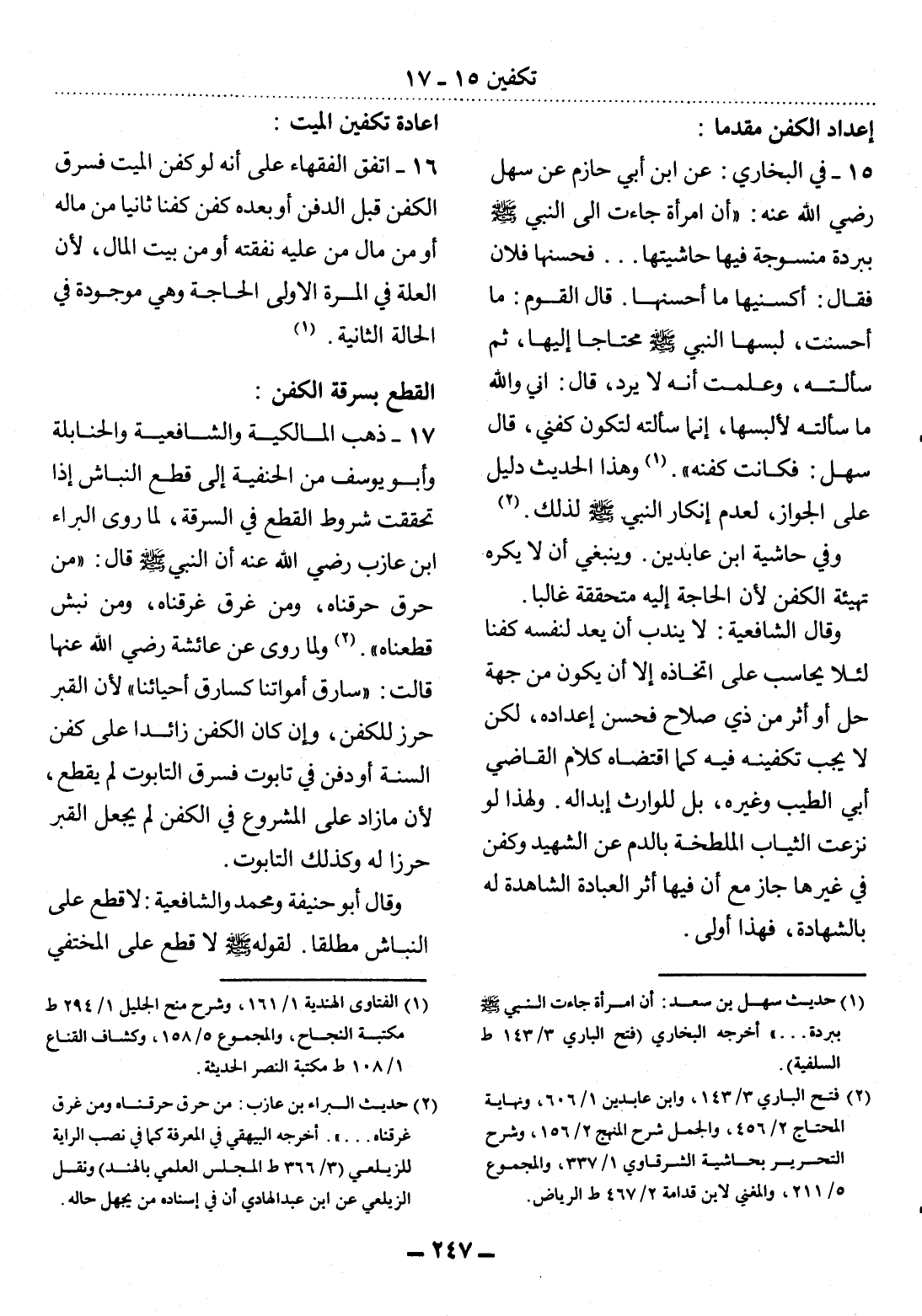 15 - فِي الْبُخَارِيِّ: عَنِ ابْنِ أَبِي حَازِمٍ عَنْ سَهْلٍ رَضِيَ اللَّهُ عَنْهُ: أَنَّ امْرَأَةً جَاءَتْ إِلَى النَّبِيِّ صَلَّى اللَّهُ عَلَيْهِ وَسَلَّمَ بِبُرْدَةٍ مَنْسُوجَةٍ فِيهَا حَاشِيَتُهَا. . . فَحَسَّنَهَا فُلاَنٌ فَقَال: أَكْسِنِيهَا مَا أَحْسَنَهَا. قَال الْقَوْمُ: مَا أَحْسَنْتَ، لَبِسَهَا النَّبِيُّ صَلَّى اللَّهُ عَلَيْهِ وَسَلَّمَ مُحْتَاجًا إِلَيْهَا، ثُمَّ سَأَلْتَهُ، وَعَلِمْتَ أَنَّهُ لاَ يَرُدُّ، قَال: إِنِّي وَاَللَّهِ مَا سَأَلْتُهُ لأَِلْبَسَهَا، إِنَّمَا سَأَلْتُهُ لِتَكُونَ كَفَنِي، قَال سَهْلٌ: فَكَانَتْ كَفَنَهُ (1) . وَهَذَا الْحَدِيثُ دَلِيلٌ عَلَى الْجَوَازِ، لِعَدَمِ إِنْكَارِ النَّبِيِّ صَلَّى اللَّهُ عَلَيْهِ وَسَلَّمَ لِذَلِكَ (2) . وَفِي حَاشِيَةِ ابْنِ عَابِدِينَ. وَيَنْبَغِي أَنْ لاَ يُكْرَهَ تَهْيِئَةُ الْكَفَنِ لأَِنَّ الْحَاجَةَ إِلَيْهِ مُتَحَقِّقَةٌ غَالِبًا. وَقَال الشَّافِعِيَّةُ: لاَ يُنْدَبُ أَنْ يَعُدَّ لِنَفْسِهِ كَفَنًا لِئَلاَّ يُحَاسَبَ عَلَى اتِّخَاذِهِ إِلاَّ أَنْ يَكُونَ مِنْ جِهَةِ حَلٍّ أَوْ أَثَرٍ مِنْ ذِي صَلاَحٍ فَحَسُنَ إِعْدَادُهُ، لَكِنْ لاَ يَجِبُ تَكْفِينُهُ فِيهِ كَمَا اقْتَضَاهُ كَلاَمُ الْقَاضِي أَبِي الطَّيِّبِ وَغَيْرِهِ، بَل لِلْوَارِثِ إِبْدَالُهُ. وَلِهَذَا لَوْ نُزِعَتِ الثِّيَابُ الْمُلَطَّخَةُ بِالدَّمِ عَنِ الشَّهِيدِ وَكُفِّنَ فِي غَيْرِهَا جَازَ مَعَ أَنَّ فِيهَا أَثَرَ الْعِبَادَةِ الشَّاهِدَةِ لَهُ بِالشَّهَادَةِ، فَهَذَا أَوْلَى.