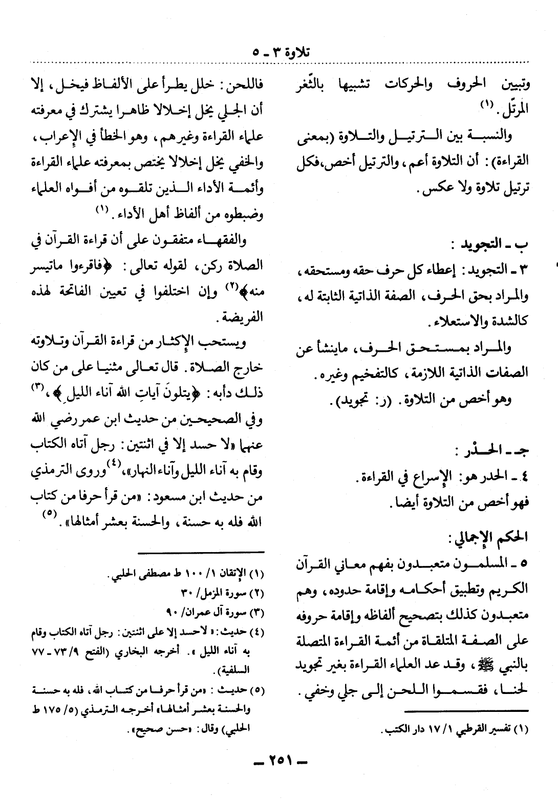 5 - الْمُسْلِمُونَ مُتَعَبَّدُونَ بِفَهْمِ مَعَانِي الْقُرْآنِ الْكَرِيمِ وَتَطْبِيقِ أَحْكَامِهِ وَإِقَامَةِ حُدُودِهِ، وَهُمْ مُتَعَبِّدُونَ كَذَلِكَ بِتَصْحِيحِ أَلْفَاظِهِ وَإِقَامَةِ حُرُوفِهِ عَلَى الصِّفَةِ الْمُتَلَقَّاةِ مِنْ أَئِمَّةِ الْقِرَاءَةِ الْمُتَّصِلَةِ بِالنَّبِيِّ صَلَّى اللَّهُ عَلَيْهِ وَسَلَّمَ وَقَدْ عَدَّ الْعُلَمَاءُ الْقِرَاءَةَ بِغَيْرِ تَجْوِيدٍ لَحْنًا، فَقَسَّمُوا اللَّحْنَ إِلَى جَلِيٍّ وَخَفِيٍّ.