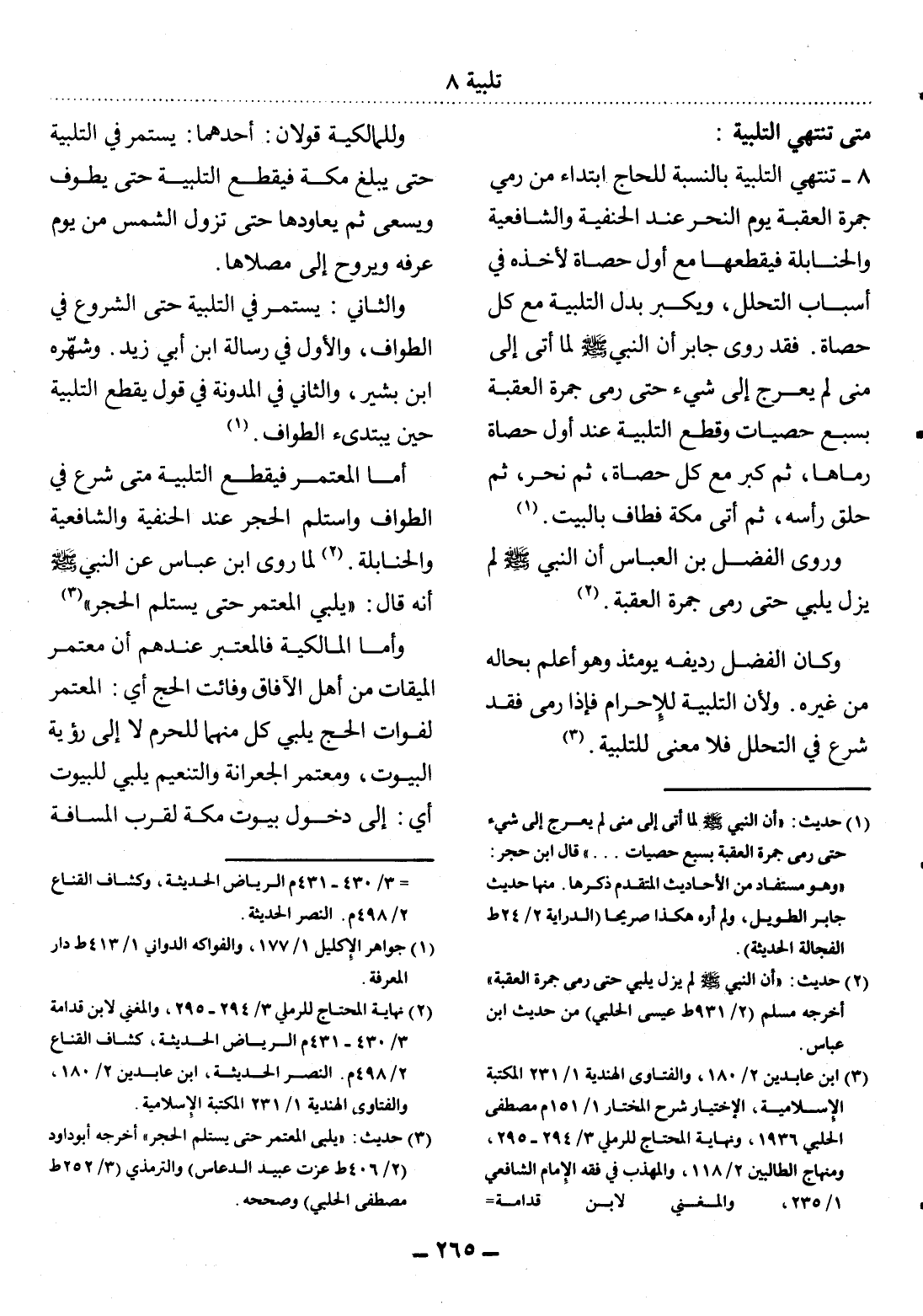 (2) حديث: " أن النبي صلى الله عليه وسلم لم يزل يلبي حتى رمى جمر العقبة " أخرجه مسلم (2 / 931 ط عيسى الحلبي) من حديث ابن عباس.