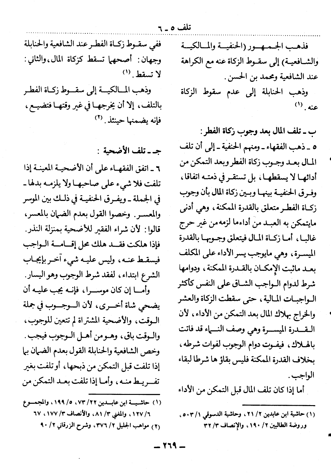 5 - ذَهَبَ الْفُقَهَاءُ - وَمِنْهُمُ الْحَنَفِيَّةُ - إِلَى أَنَّ تَلَفَ الْمَال بَعْدَ وُجُوبِ زَكَاةِ الْفِطْرِ وَبَعْدَ التَّمَكُّنِ مِنْ أَدَائِهَا لاَ يُسْقِطُهَا، بَل تَسْتَقِرُّ فِي ذِمَّتِهِ اتِّفَاقًا، وَفَرَّقَ الْحَنَفِيَّةُ بَيْنَهَا وَبَيْنَ زَكَاةِ الْمَال بِأَنَّ وُجُوبَ زَكَاةِ الْفِطْرِ مُتَعَلِّقٌ بِالْقُدْرَةِ الْمُمْكِنَةِ، وَهِيَ أَدْنَى مَا يَتَمَكَّنُ بِهِ الْعَبْدُ مِنْ أَدَاءِ مَا لَزِمَهُ مِنْ غَيْرِ حَرَجٍ غَالِبًا، أَمَّا زَكَاةُ الْمَال فَيَتَعَلَّقُ وُجُوبُهَا بِالْقُدْرَةِ الْمُيَسَّرَةِ، وَهِيَ مَا يُوجِبُ يُسْرَ الأَْدَاءِ عَلَى الْمُكَلَّفِ بَعْدَمَا ثَبَتَ الإِْمْكَانُ بِالْقُدْرَةِ الْمُمْكِنَةِ، وَدَوَامُهَا شَرْطٌ لِدَوَامِ الْوَاجِبِ الشَّاقِّ عَلَى النَّفْسِ كَأَكْثَرِ الْوَاجِبَاتِ الْمَالِيَّةِ، حَتَّى سَقَطَتِ الزَّكَاةُ وَالْعُشْرُ وَالْخَرَاجُ بِهَلاَكِ الْمَال بَعْدَ التَّمَكُّنِ مِنَ الأَْدَاءِ؛ لأَِنَّ الْقُدْرَةَ الْمُيَسَّرَةَ وَهِيَ وَصْفُ النَّمَاءِ قَدْ فَاتَتْ بِالْهَلاَكِ، فَيَفُوتُ دَوَامُ الْوُجُوبِ لِفَوَاتِ شَرْطِهِ، بِخِلاَفِ الْقُدْرَةِ الْمُمْكِنَةِ فَلَيْسَ بَقَاؤُهَا شَرْطًا لِبَقَاءِ الْوَاجِبِ.