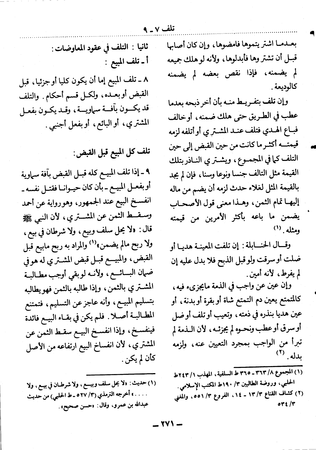8 - تَلَفُ الْمَبِيعِ إِمَّا أَنْ يَكُونَ كُلِّيًّا أَوْ جُزْئِيًّا، قَبْل الْقَبْضِ أَوْ بَعْدَهُ، وَلِكُل قِسْمٍ أَحْكَامٌ. وَالتَّلَفُ قَدْ يَكُونُ بِآفَةٍ سَمَاوِيَّةٍ، وَقَدْ يَكُونُ بِفِعْل الْمُشْتَرِي، أَوِ الْبَائِعِ، أَوْ بِفِعْل أَجْنَبِيٍّ.