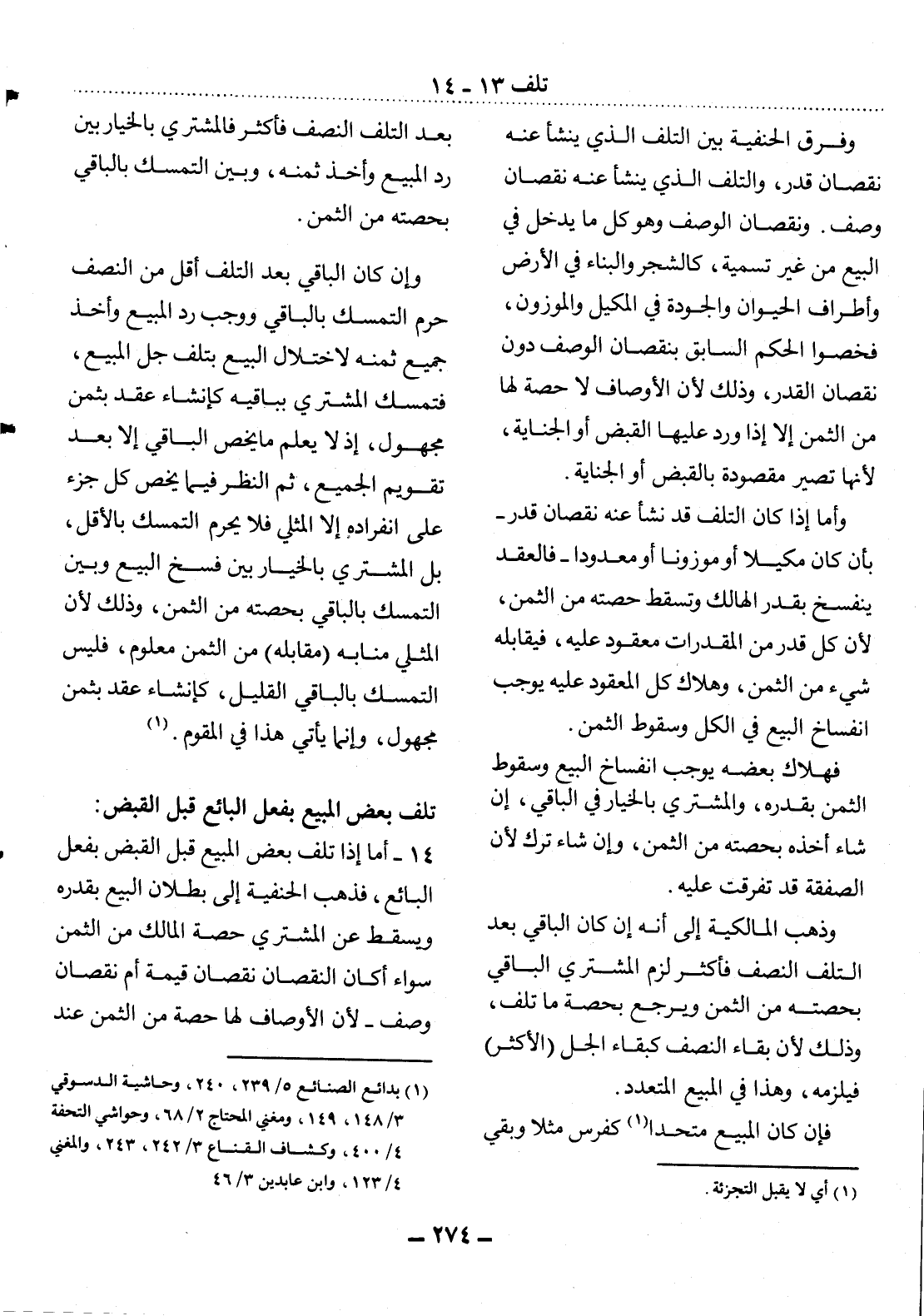 وَفَرَّقَ الْحَنَفِيَّةُ بَيْنَ التَّلَفِ الَّذِي يَنْشَأُ عَنْهُ نُقْصَانُ قَدْرٍ، وَالتَّلَفُ الَّذِي يَنْشَأُ عَنْهُ نُقْصَانُ وَصْفٍ. وَنُقْصَانُ الْوَصْفِ وَهُوَ كُل مَا يَدْخُل فِي الْبَيْعِ مِنْ غَيْرِ تَسْمِيَةٍ، كَالشَّجَرِ وَالْبِنَاءِ فِي الأَْرْضِ وَأَطْرَافِ الْحَيَوَانِ وَالْجَوْدَةِ فِي الْمَكِيل وَالْمَوْزُونِ، فَخَصُّوا الْحُكْمَ السَّابِقَ بِنُقْصَانِ الْوَصْفِ دُونَ نُقْصَانِ الْقَدْرِ، وَذَلِكَ لأَِنَّ الأَْوْصَافَ لاَ حِصَّةَ لَهَا مِنَ الثَّمَنِ إِلاَّ إِذَا وَرَدَ عَلَيْهَا الْقَبْضُ أَوِ الْجِنَايَةُ، لأَِنَّهَا تَصِيرُ مَقْصُودَةً بِالْقَبْضِ أَوِ الْجِنَايَةِ.