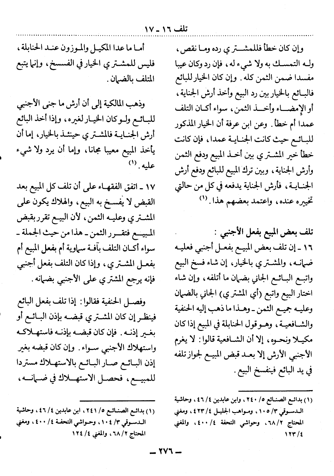 16 - إِنْ تَلِفَ بَعْضُ الْمَبِيعِ بِفِعْل أَجْنَبِيٍّ فَعَلَيْهِ ضَمَانُهُ، وَالْمُشْتَرِي بِالْخِيَارِ، إِنْ شَاءَ فَسَخَ الْبَيْعَ وَأَتْبَعَ الْبَائِعُ الْجَانِيَ بِضَمَانِ مَا أَتْلَفَهُ، وَإِنْ شَاءَ اخْتَارَ الْبَيْعَ وَأَتْبَعَ (أَيِ الْمُشْتَرِي) الْجَانِيَ بِالضَّمَانِ وَعَلَيْهِ جَمِيعُ الثَّمَنِ - وَهَذَا مَا ذَهَبَ إِلَيْهِ الْحَنَفِيَّةُ وَالشَّافِعِيَّةُ، وَهُوَ قَوْل الْحَنَابِلَةِ فِي الْمَبِيعِ إِذَا كَانَ مَكِيلاً وَنَحْوَهُ، إِلاَّ أَنَّ الشَّافِعِيَّةَ قَالُوا: لاَ يَغْرَمُ الأَْجْنَبِيُّ الأَْرْشَ إِلاَّ بَعْدَ قَبْضِ الْمَبِيعِ لِجَوَازِ تَلَفِهِ فِي يَدِ الْبَائِعِ فَيَنْفَسِخُ الْبَيْعُ.