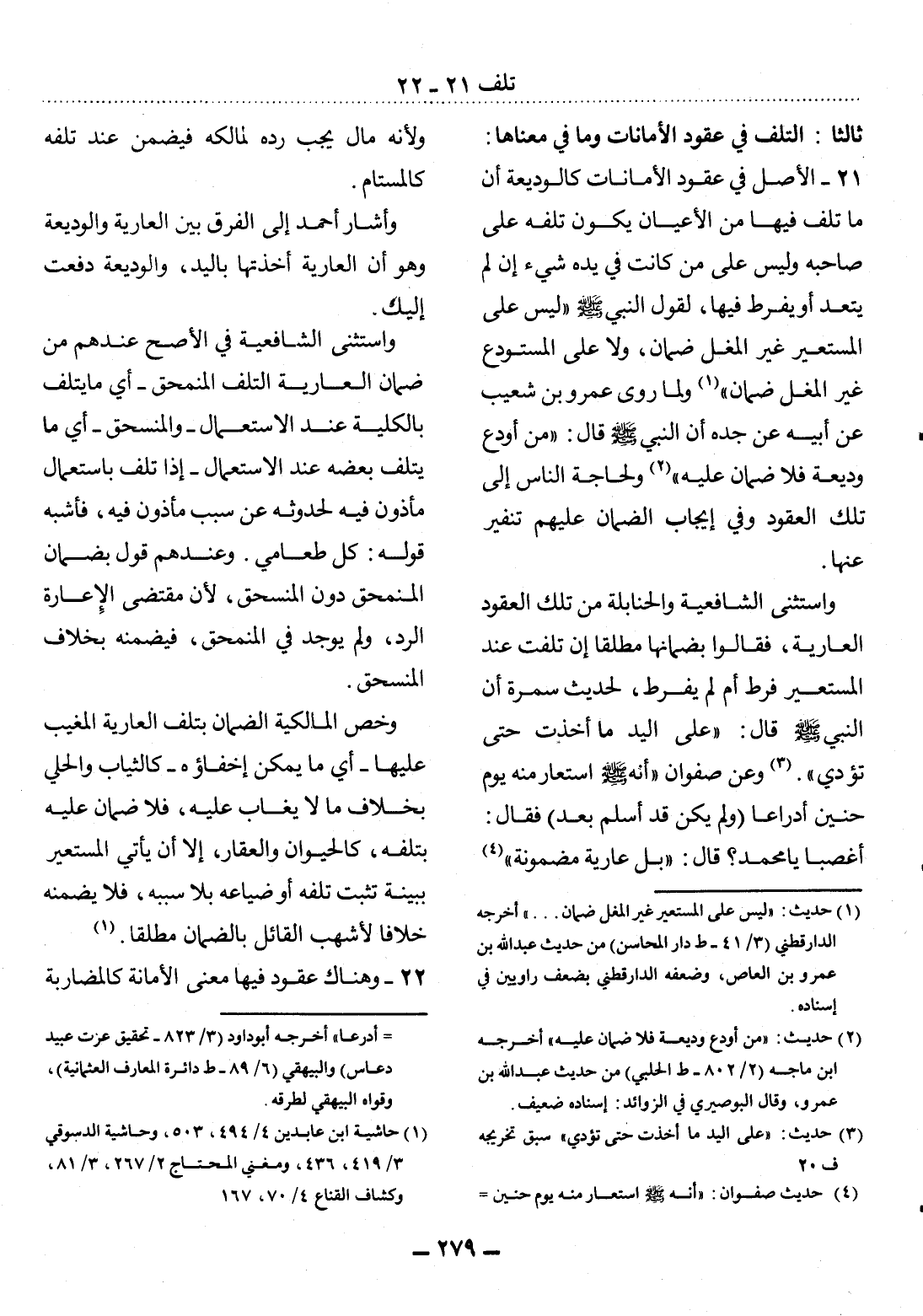 21 - الأَْصْل فِي عُقُودِ الأَْمَانَاتِ كَالْوَدِيعَةِ أَنَّ مَا تَلِفَ فِيهَا مِنَ الأَْعْيَانِ يَكُونُ تَلَفُهُ عَلَى صَاحِبِهِ وَلَيْسَ عَلَى مَنْ كَانَتْ فِي يَدِهِ شَيْءٌ إِنْ لَمْ يَتَعَدَّ أَوْ يُفَرِّطْ فِيهَا، لِقَوْل النَّبِيِّ صَلَّى اللَّهُ عَلَيْهِ وَسَلَّمَ لَيْسَ عَلَى الْمُسْتَعِيرِ غَيْرِ الْمُغِل ضَمَانٌ، وَلاَ عَلَى الْمُسْتَوْدَعِ غَيْرِ الْمُغِل ضَمَانٌ (1) وَلِمَا رَوَى عَمْرُو بْنُ شُعَيْبٍ عَنْ أَبِيهِ عَنْ جَدِّهِ أَنَّ النَّبِيَّ صَلَّى اللَّهُ عَلَيْهِ وَسَلَّمَ قَال: مَنْ أُودِعَ وَدِيعَةً فَلاَ ضَمَانَ عَلَيْهِ (2) وَلِحَاجَةِ النَّاسِ إِلَى تِلْكَ الْعُقُودِ وَفِي إِيجَابِ الضَّمَانِ عَلَيْهِمْ تَنْفِيرٌ عَنْهَا.