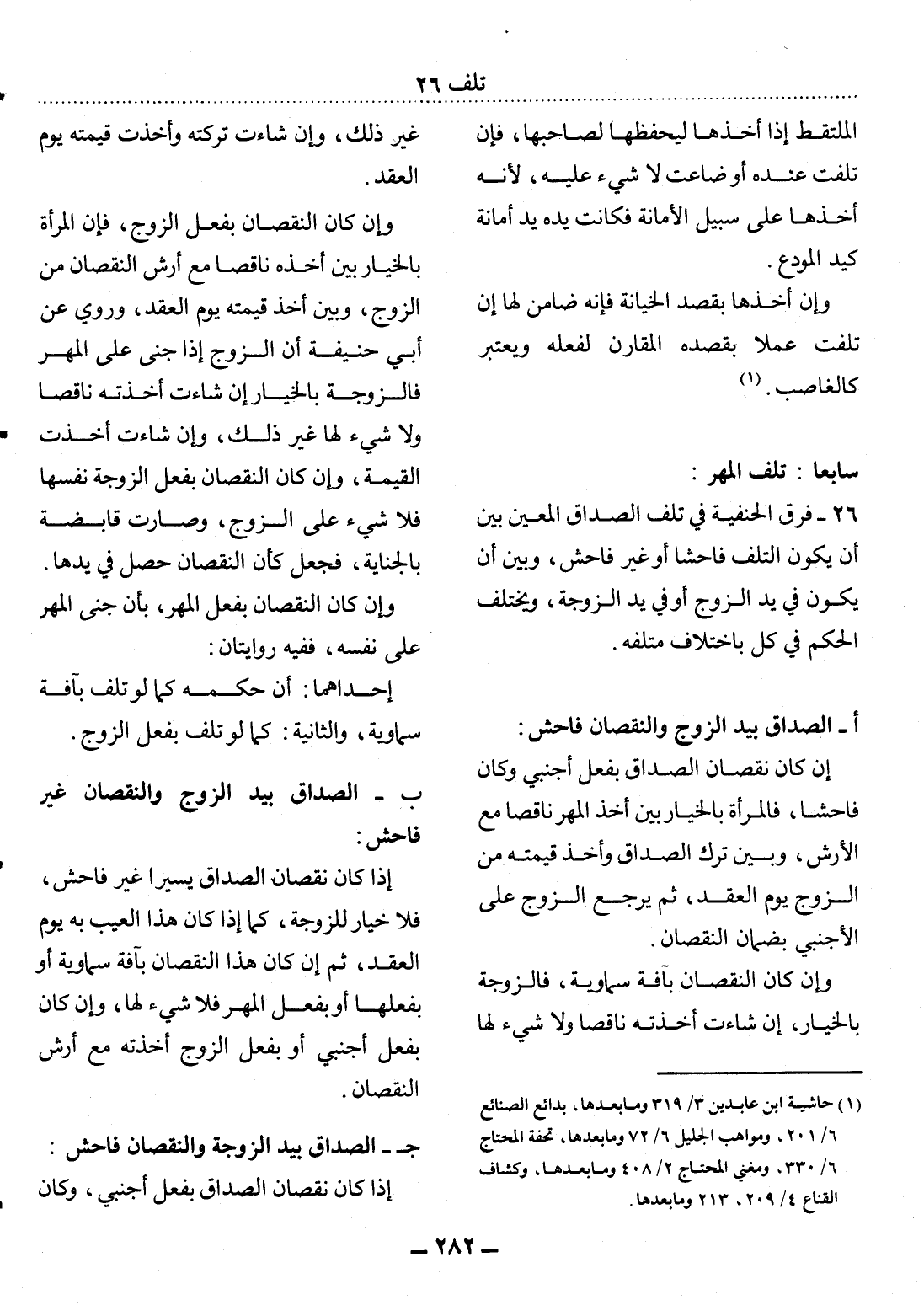 26 - فَرَّقَ الْحَنَفِيَّةُ فِي تَلَفِ الصَّدَاقِ الْمُعَيَّنِ بَيْنَ أَنْ يَكُونَ التَّلَفُ فَاحِشًا أَوْ غَيْرَ فَاحِشٍ، وَبَيْنَ أَنْ يَكُونَ فِي يَدِ الزَّوْجِ أَوْ فِي يَدِ الزَّوْجَةِ، وَيَخْتَلِفُ الْحُكْمُ فِي كُلٍّ بِاخْتِلاَفِ مُتْلِفِهِ.