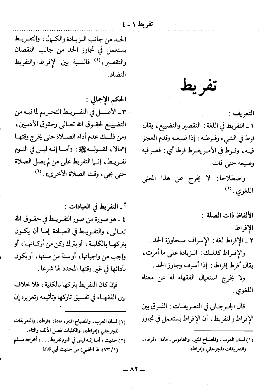 (1) لسان العرب، والمصباح المنير، والقاموس، مادة: " فرط "، والتعريفات للجرجاني " إفراط "