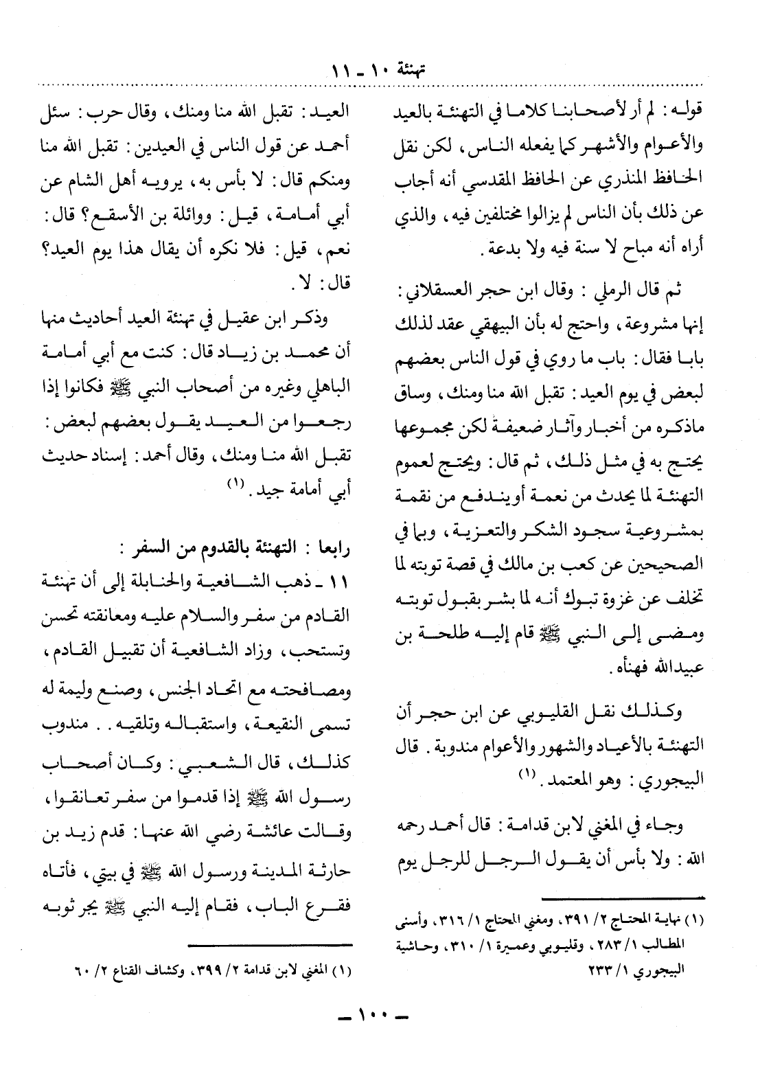 وَذَكَرَ ابْنُ عَقِيلٍ فِي تَهْنِئَةِ الْعِيدِ أَحَادِيثَ مِنْهَا أَنَّ مُحَمَّدَ بْنَ زِيَادٍ قَال: كُنْتُ مَعَ أَبِي أُمَامَةَ الْبَاهِلِيِّ وَغَيْرِهِ مِنْ أَصْحَابِ النَّبِيِّ صَلَّى اللَّهُ عَلَيْهِ وَسَلَّمَ فَكَانُوا إِذَا رَجَعُوا مِنَ الْعِيدِ يَقُول بَعْضُهُمْ لِبَعْضٍ: تَقَبَّل اللَّهُ مِنَّا وَمِنْك، وَقَال أَحْمَدُ: إِسْنَادُ حَدِيثِ أَبِي أُمَامَةَ جَيِّدٌ (1) .