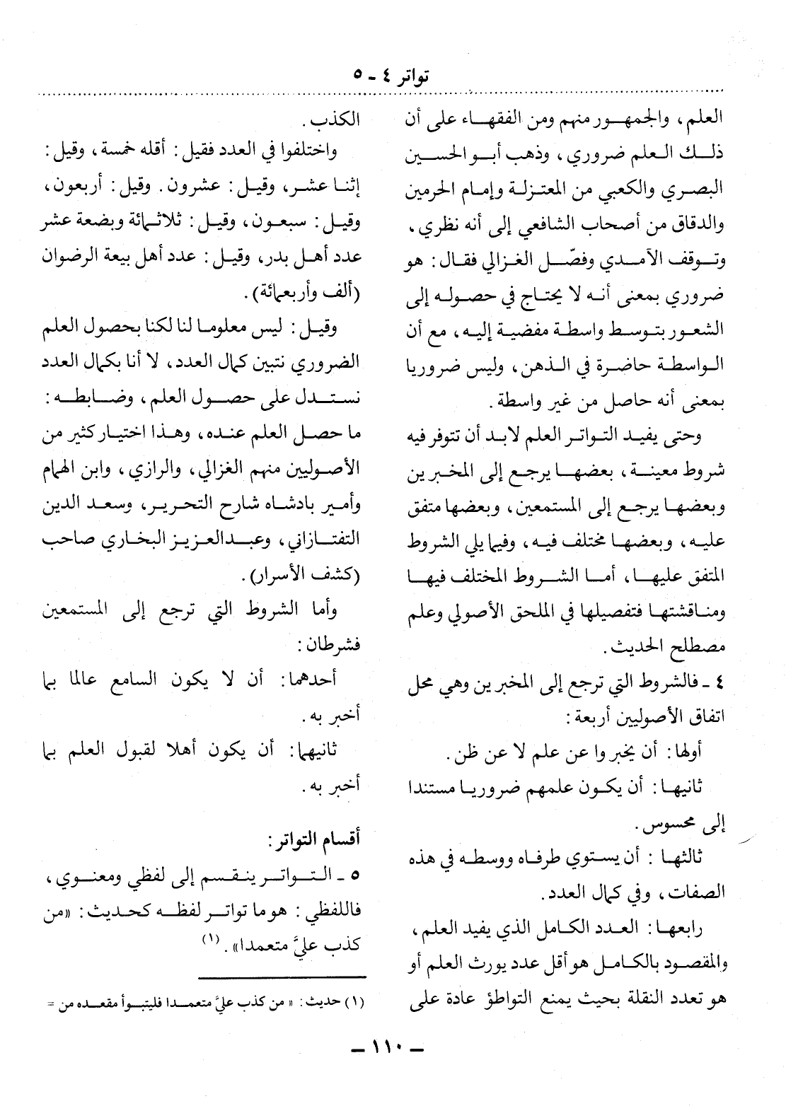 5 - التَّوَاتُرُ يَنْقَسِمُ إِلَى لَفْظِيٍّ وَمَعْنَوِيٍّ، فَاللَّفْظِيُّ: هُوَ مَا تَوَاتَرَ لَفْظُهُ كَحَدِيثِ: مَنْ كَذَبَ عَلَيَّ مُتَعَمِّدًا (1) ".