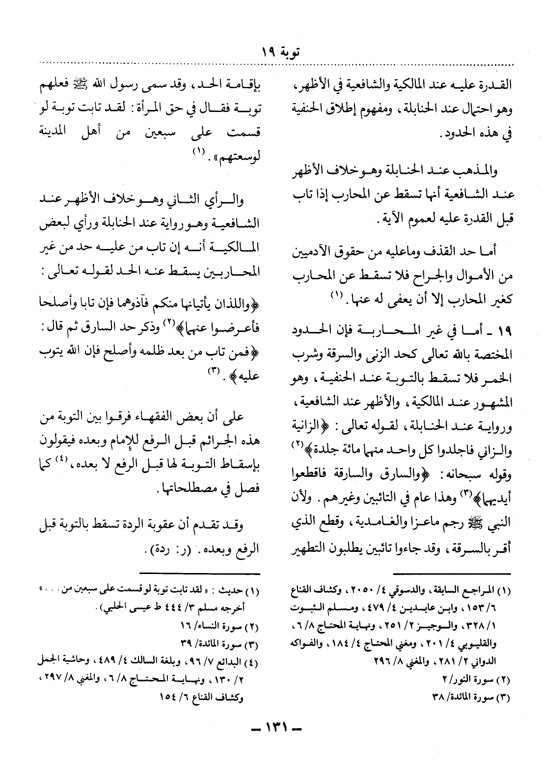 عَلَى أَنَّ بَعْضَ الْفُقَهَاءِ فَرَّقُوا بَيْنَ التَّوْبَةِ مِنْ هَذِهِ الْجَرَائِمِ قَبْل الرَّفْعِ لِلإِْمَامِ وَبَعْدَهُ فَيَقُولُونَ بِإِسْقَاطِ التَّوْبَةِ لَهَا قَبْل الرَّفْعِ لاَ بَعْدَهُ (4) . كَمَا فُصِّل فِي مُصْطَلَحَاتِهَا،