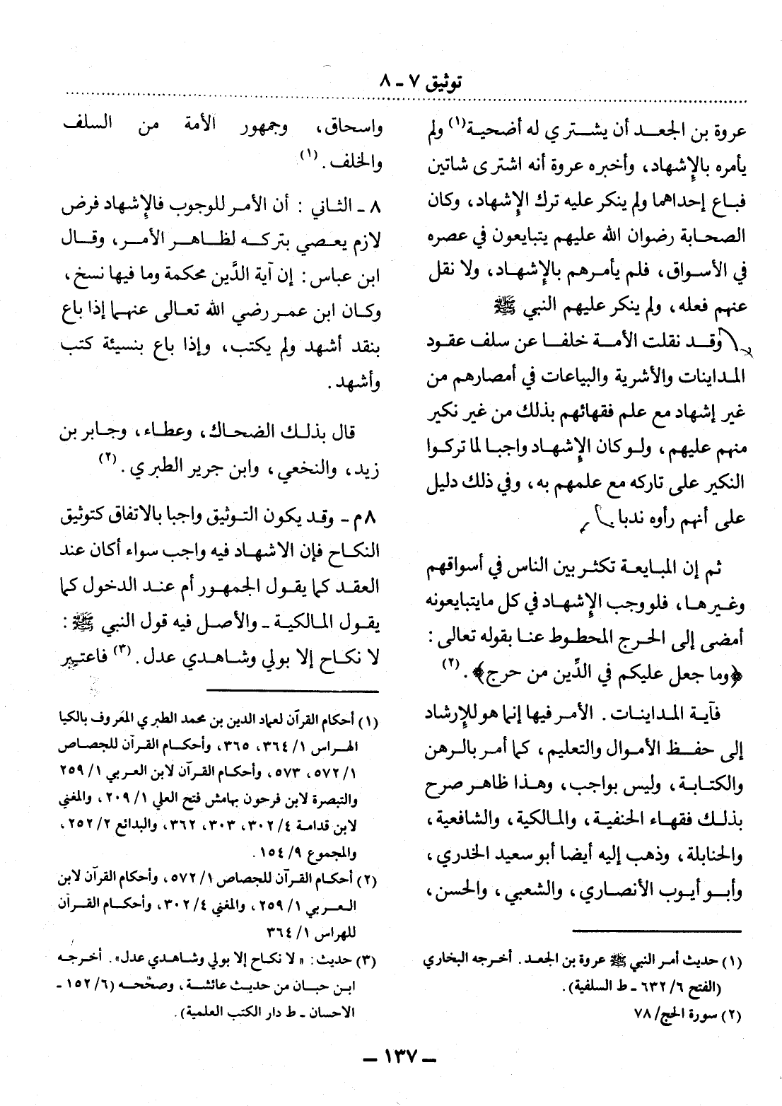 8 - الثَّانِي: أَنَّ الأَْمْرَ لِلْوُجُوبِ فَالإِْشْهَادُ فَرْضٌ لاَزِمٌ يَعْصِي بِتَرْكِهِ لِظَاهِرِ الأَْمْرِ، وَقَال ابْنُ عَبَّاسٍ: إِنَّ آيَةَ الدَّيْنِ مُحْكَمَةٌ وَمَا فِيهَا نَسْخٌ، وَكَانَ ابْنُ عُمَرَ رَضِيَ اللَّهُ تَعَالَى عَنْهُمَا إِذَا بَاعَ بِنَقْدٍ أَشْهَدَ وَلَمْ يَكْتُبْ، وَإِذَا بَاعَ بِنَسِيئَةٍ كَتَبَ وَأَشْهَدَ.