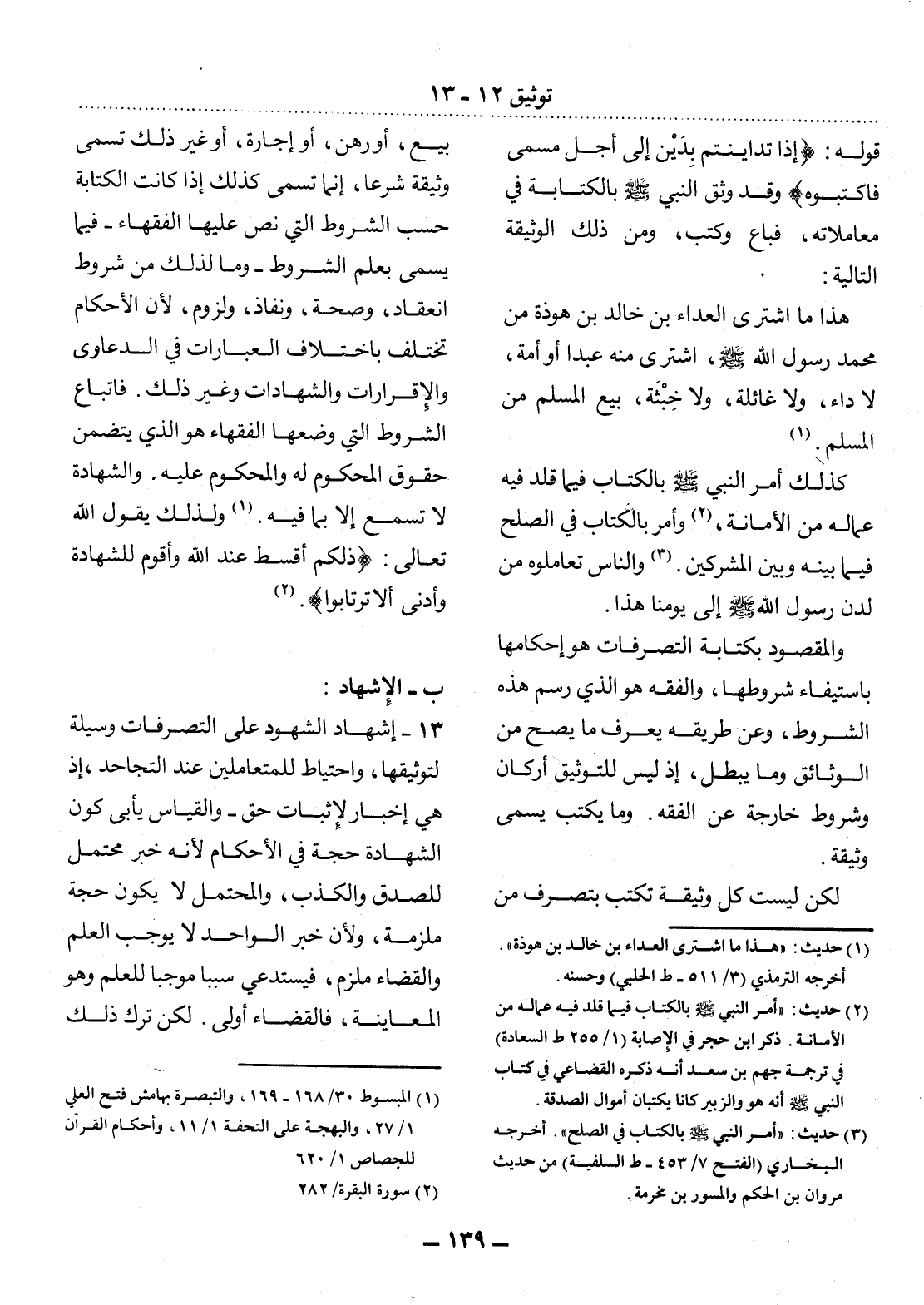 قَوْلِهِ: {إِذَا تَدَايَنْتُمْ بِدَيْنٍ إِلَى أَجَلٍ مُسَمًّى فَاكْتُبُوهُ} وَقَدْ وَثَّقَ النَّبِيُّ صَلَّى اللَّهُ عَلَيْهِ وَسَلَّمَ بِالْكِتَابَةِ فِي مُعَامَلاَتِهِ، فَبَاعَ وَكَتَبَ، وَمِنْ ذَلِكَ الْوَثِيقَةُ التَّالِيَةُ: