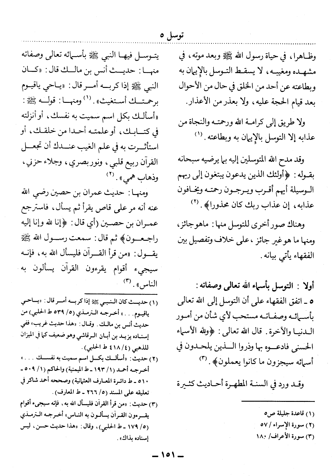 5 - اتَّفَقَ الْفُقَهَاءُ عَلَى أَنَّ التَّوَسُّل إِلَى اللَّهِ تَعَالَى بِأَسْمَائِهِ وَصِفَاتِهِ مُسْتَحَبٌّ لأَِيِّ شَأْنٍ مِنْ أُمُورِ الدُّنْيَا وَالآْخِرَةِ. قَال اللَّهُ تَعَالَى: {وَلِلَّهِ الأَْسْمَاءُ الْحُسْنَى فَادْعُوهُ بِهَا وَذَرُوا الَّذِينَ يُلْحِدُونَ فِي أَسْمَائِهِ سَيُجْزَوْنَ مَا كَانُوا يَعْمَلُونَ (3) } .