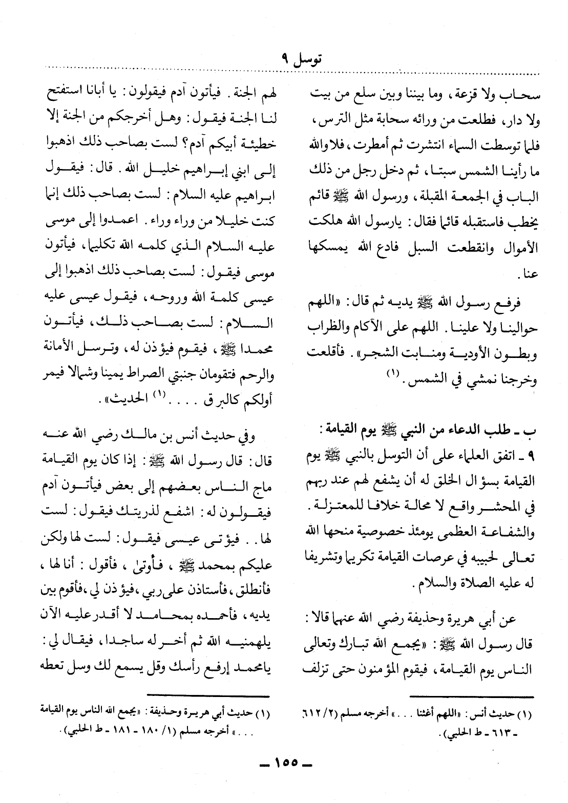 9 - اتَّفَقَ الْعُلَمَاءُ عَلَى أَنَّ التَّوَسُّل بِالنَّبِيِّ صَلَّى اللَّهُ عَلَيْهِ وَسَلَّمَ يَوْمَ الْقِيَامَةِ بِسُؤَال الْخَلْقِ لَهُ أَنْ يَشْفَعَ لَهُمْ عِنْدَ رَبِّهِمْ فِي الْمَحْشَرِ وَاقِعٌ لاَ مَحَالَةَ خِلاَفًا لِلْمُعْتَزِلَةِ.