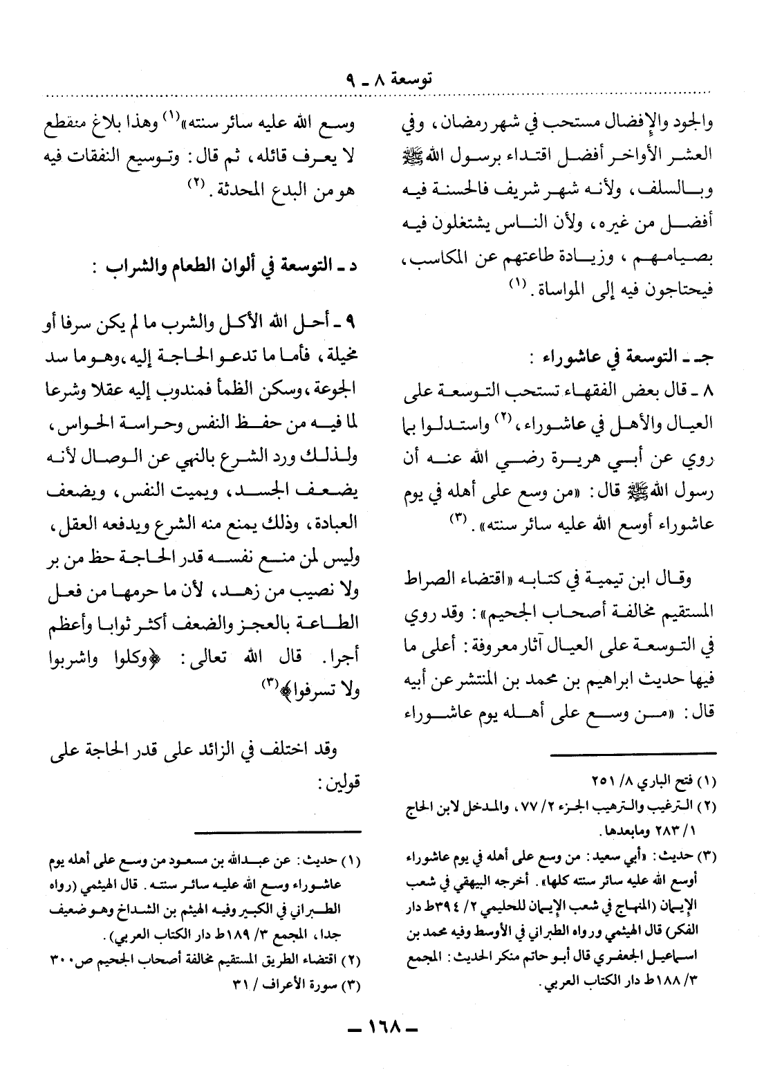 وَقَال ابْنُ تَيْمِيَّةَ فِي كِتَابِهِ " اقْتِضَاءُ الصِّرَاطِ الْمُسْتَقِيمِ وَمُخَالَفةُ أَصْحَابِ الْجَحِيمِ ": وَقَدْ رُوِيَ فِي التَّوْسِعَةِ عَلَى الْعِيَال آثَارٌ مَعْرُوفَةٌ: أَعْلَى مَا فِيهَا حَدِيثُ إِبْرَاهِيمَ بْنِ مُحَمَّدِ بْنِ الْمُنْتَشِرِ عَنْ أَبِيهِ قَال: مَنْ وَسَّعَ عَلَى أَهْلِهِ يَوْمَ عَاشُورَاءَ