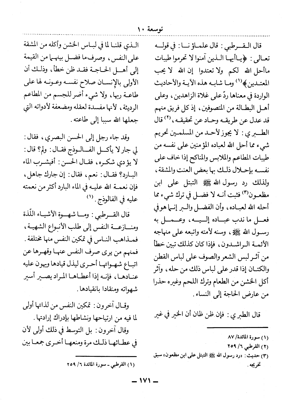 قَال الْقُرْطُبِيُّ: قَال عُلَمَاؤُنَا: فِي قَوْله تَعَالَى: {يَا أَيُّهَا الَّذِينَ آمَنُوا لاَ تُحَرِّمُوا طَيِّبَاتِ مَا أَحَل اللَّهُ لَكُمْ وَلاَ تَعْتَدُوا إِنَّ اللَّهَ لاَ يُحِبُّ الْمُعْتَدِينَ (1) } وَمَا شَابَهَ هَذِهِ الآْيَةَ وَالأَْحَادِيثَ الْوَارِدَةَ فِي مَعْنَاهَا رَدٌّ عَلَى غُلاَةِ الزَّاهِدِينَ، وَعَلَى أَهْل الْبَطَالَةِ مِنَ الْمُتَصَوِّفِينَ؛ إِذْ كُل فَرِيقٍ مِنْهُمْ قَدْ عَدَل عَنْ طَرِيقِهِ وَحَادَ عَنْ تَحْقِيقِهِ (2) ، قَال الطَّبَرِيُّ: لاَ يَجُوزُ لأَِحَدٍ مِنَ الْمُسْلِمِينَ تَحْرِيمُ شَيْءٍ مِمَّا أَحَل اللَّهُ لِعِبَادِهِ الْمُؤْمِنِينَ عَلَى نَفْسِهِ مِنْ طَيِّبَاتِ الْمَطَاعِمِ وَالْمَلاَبِسِ وَالْمُنَاكَحِ إِذَا خَافَ عَلَى نَفْسِهِ بِإِحْلاَل ذَلِكَ بِهَا بَعْضَ الْعَنَتِ وَالْمَشَقَّةِ؛ وَلِذَلِكَ رَدَّ رَسُول اللَّهِ صَلَّى اللَّهُ عَلَيْهِ وَسَلَّمَ التَّبَتُّل عَلَى ابْنِ مَظْعُونٍ (3) فَثَبَتَ أَنَّهُ لاَ فَضْل فِي تَرْكِ شَيْءٍ مِمَّا أَحَلَّهُ اللَّهُ لِعِبَادِهِ، وَأَنَّ الْفَضْل وَالْبِرَّ إِنَّمَا هُوَ فِي فِعْل مَا نَدَبَ عِبَادَهُ إِلَيْهِ، وَعَمِل بِهِ رَسُول اللَّهِ صَلَّى اللَّهُ عَلَيْهِ وَسَلَّمَ وَسَنَّهُ لأُِمَّتِهِ وَاتَّبَعَهُ عَلَى مِنْهَاجِهِ الأَْئِمَّةُ الرَّاشِدُونَ، فَإِذَا كَانَ كَذَلِكَ تَبَيَّنَ خَطَأُ مَنْ آثَرَ لُبْسَ الشَّعْرِ وَالصُّوفِ عَلَى لِبَاسِ الْقُطْنِ وَالْكَتَّانِ إِذَا قَدَرَ عَلَى لِبَاسِ ذَلِكَ مِنْ حِلِّهِ، وَآثَرَ أَكْل الْخَشِنِ مِنَ الطَّعَامِ وَتَرَكَ اللَّحْمَ وَغَيْرَهُ حَذَرًا مِنْ عَارِضِ الْحَاجَةِ إِلَى النِّسَاءِ.