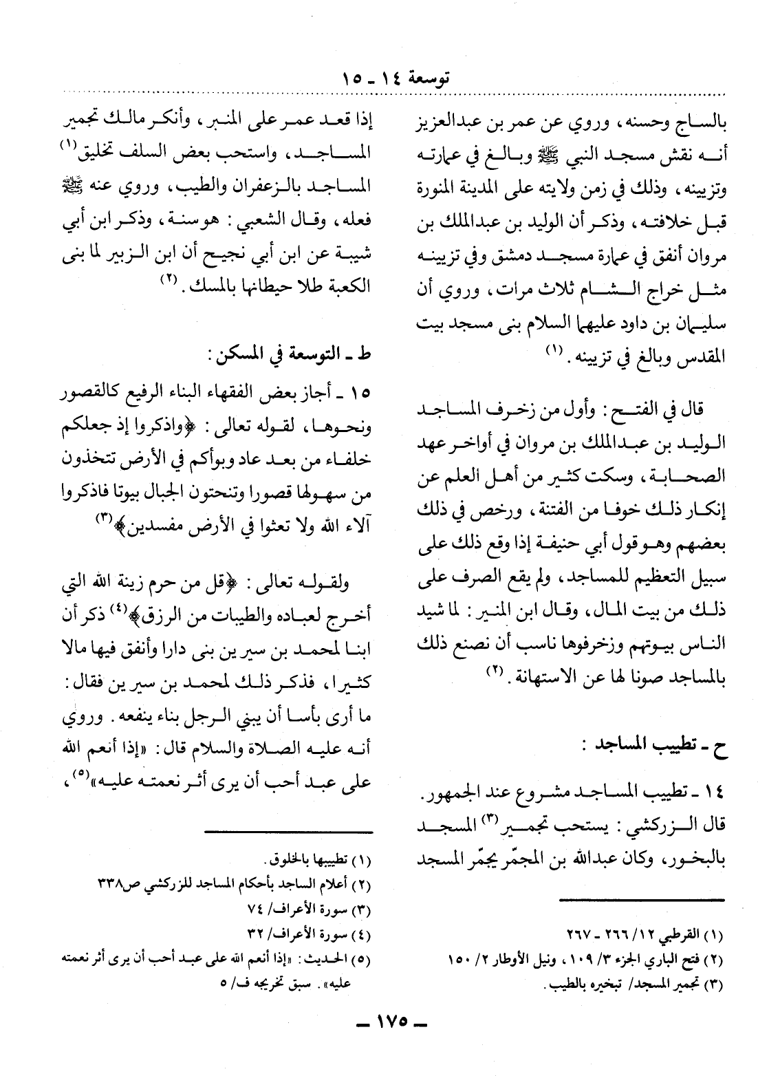 بِالسَّاجِ وَحَسَّنَهُ، وَرُوِيَ عَنْ عُمَرَ بْنِ عَبْدِ الْعَزِيزِ أَنَّهُ نَقَشَ مَسْجِدَ النَّبِيِّ صَلَّى اللَّهُ عَلَيْهِ وَسَلَّمَ وَبَالَغَ فِي عِمَارَتِهِ وَتَزْيِينِهِ، وَذَلِكَ فِي زَمَنِ وِلاَيَتِهِ عَلَى الْمَدِينَةِ الْمُنَوَّرَةِ قَبْل خِلاَفَتِهِ، وَذُكِرَ أَنَّ الْوَلِيدَ بْنَ عَبْدِ الْمَلِكِ بْنِ مَرْوَانَ أَنْفَقَ فِي عِمَارَةِ مَسْجِدِ دِمَشْقَ وَفِي تَزْيِينِهِ مِثْل خَرَاجِ الشَّامِ ثَلاَثَ مَرَّاتٍ، وَرُوِيَ أَنَّ سُلَيْمَانَ بْنَ دَاوُد عَلَيْهِمَا السَّلَامُ بَنَى مَسْجِدَ بَيْتِ الْمَقْدِسِ وَبَالَغَ فِي تَزْيِينِهِ. (1)