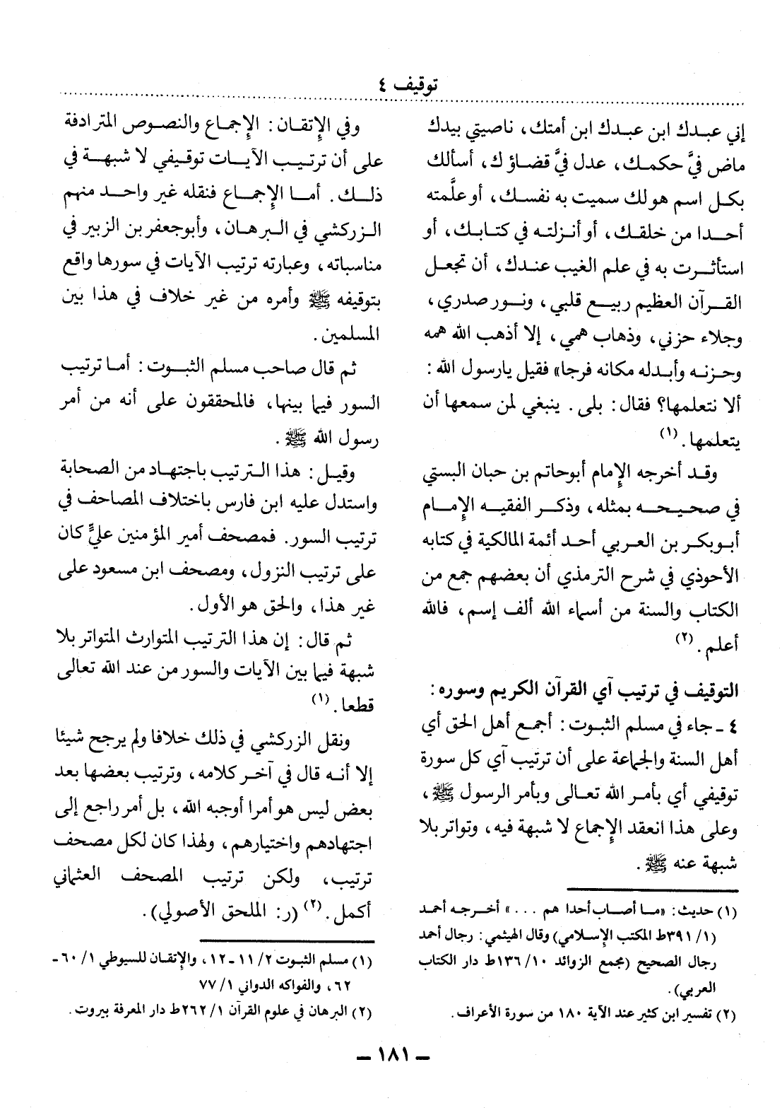 وَنَقَل الزَّرْكَشِيُّ فِي ذَلِكَ خِلاَفًا وَلَمْ يُرَجِّحْ شَيْئًا إِلاَ أَنَّهُ قَال فِي آخِرِ كَلاَمِهِ، وَتَرْتِيبُ بَعْضِهَا بَعْدَ بَعْضٍ لَيْسَ هُوَ أَمْرًا أَوْجَبَهُ اللَّهُ، بَل أَمْرٌ رَاجِعٌ إِلَى اجْتِهَادِهِمْ وَاخْتِيَارِهِمْ؛ وَلِهَذَا كَانَ لِكُل مُصْحَفٍ تَرْتِيبٌ، وَلَكِنْ تَرْتِيبُ الْمُصْحَفِ الْعُثْمَانِيِّ أَكْمَل. (2) (ر: الْمُلْحَقُ الأُْصُولِيُّ) .