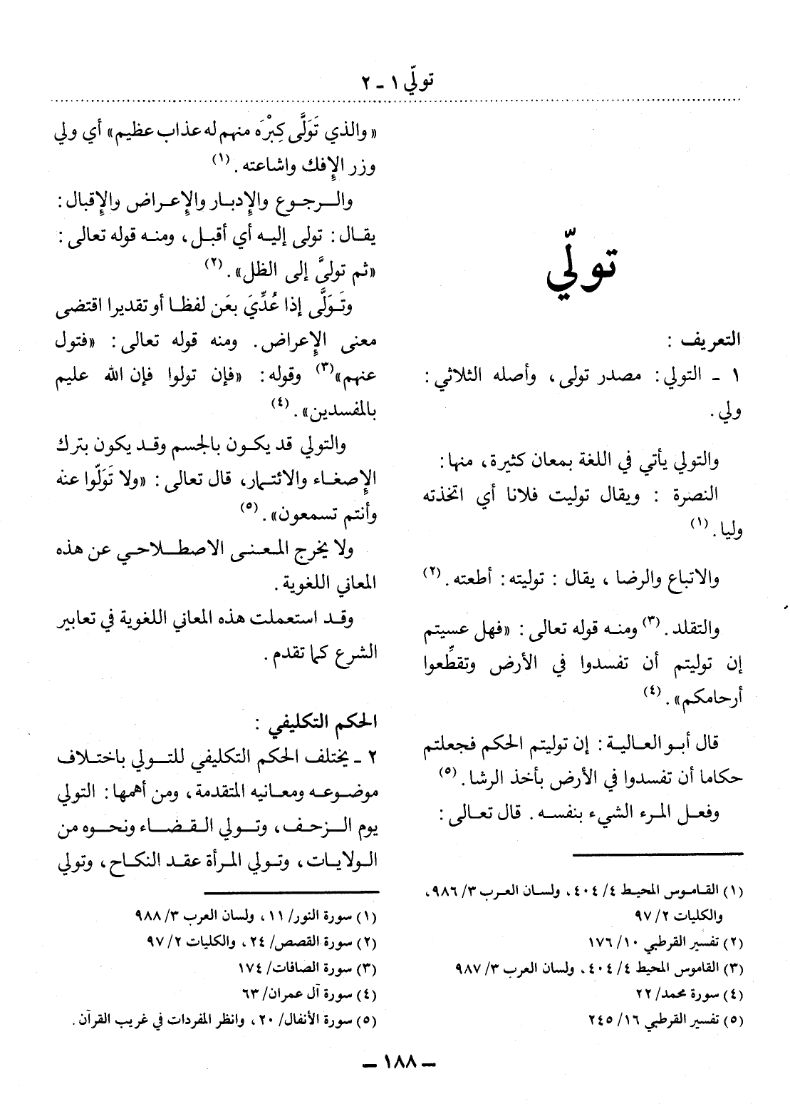 وَالتَّقَلُّدُ. (3) وَمِنْهُ قَوْله تَعَالَى: {فَهَل عَسَيْتُمْ إِنْ تَوَلَّيْتُمْ أَنْ تُفْسِدُوا فِي الأَْرْضِ وَتُقَطِّعُوا أَرْحَامَكُمْ} (4) .