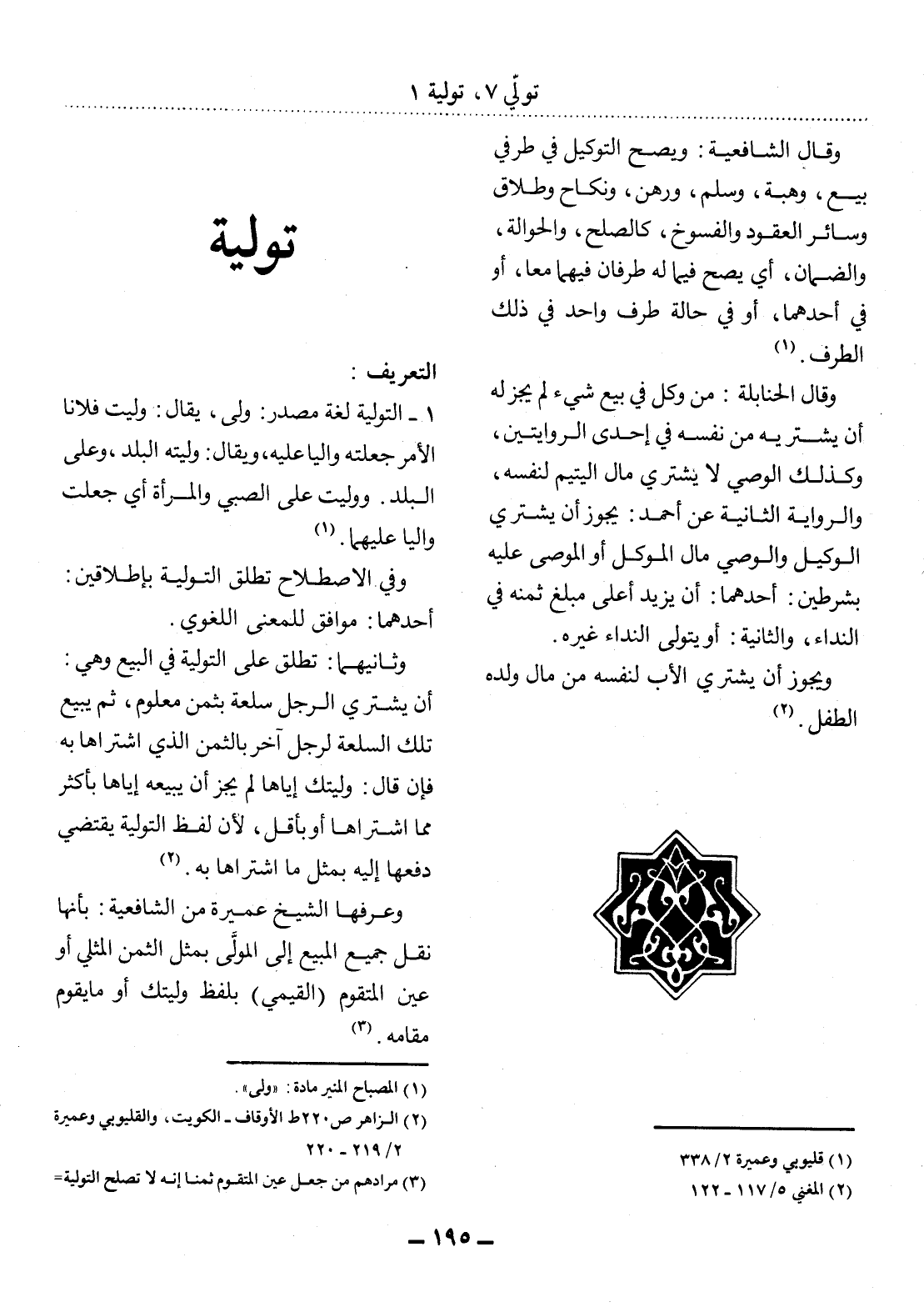 وَعَرَّفَهَا الشَّيْخُ عَمِيرَةُ مِنَ الشَّافِعِيَّةِ: بِأَنَّهَا نَقْل جَمِيعِ الْمَبِيعِ إِلَى الْمُوَلَّى بِمِثْل الثَّمَنِ الْمِثْلِيِّ أَوْ عَيْنِ الْمُتَقَوِّمِ (الْقِيَمِيِّ) بِلَفْظِ وَلَّيْتُكَ أَوْ مَا يَقُومُ مَقَامَهُ. (3)
