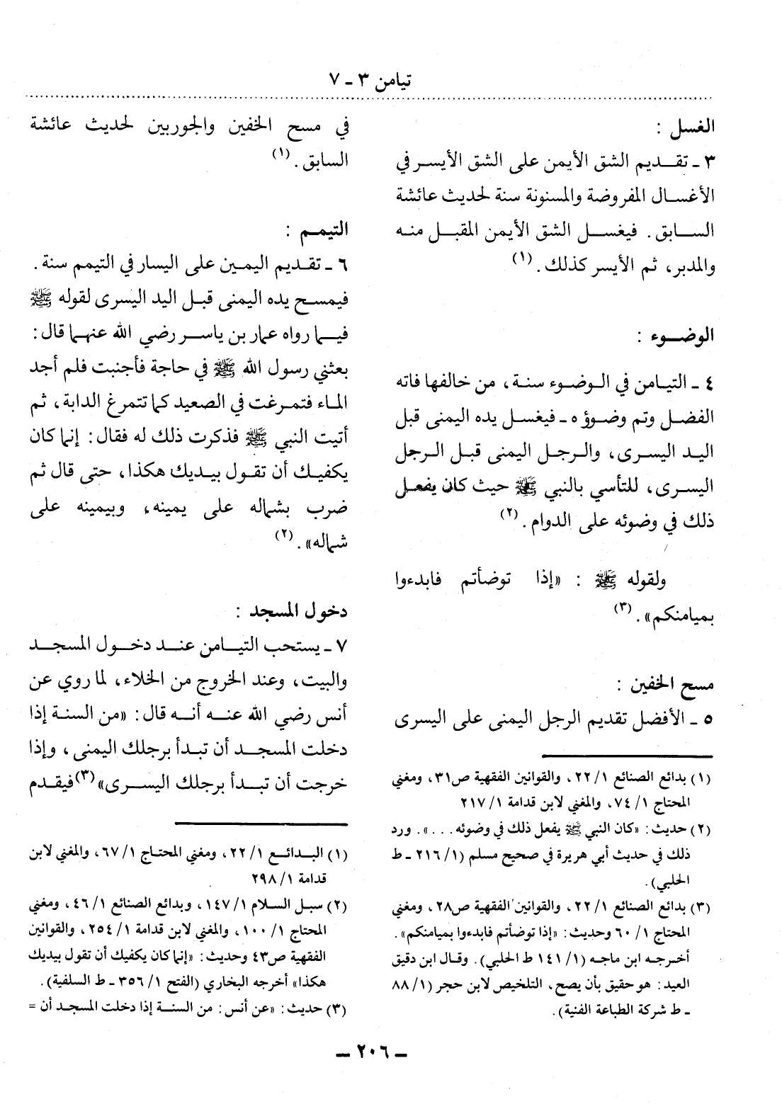 (3) بدائع الصنائع 1 / 22، والقوانين الفقهية ص28، ومغني المحتاج 1 / 60 وحديث: " إذا توضأتم فابدءوا بميامنكم ". أخرجه ابن ماجه (1 / 141 ط الحلبي) . وقال ابن دقيق العيد: هو حقيق بأن يصح، التلخيص لابن حجر (1 / 88 - ط شركة الطباعة الفنية) .