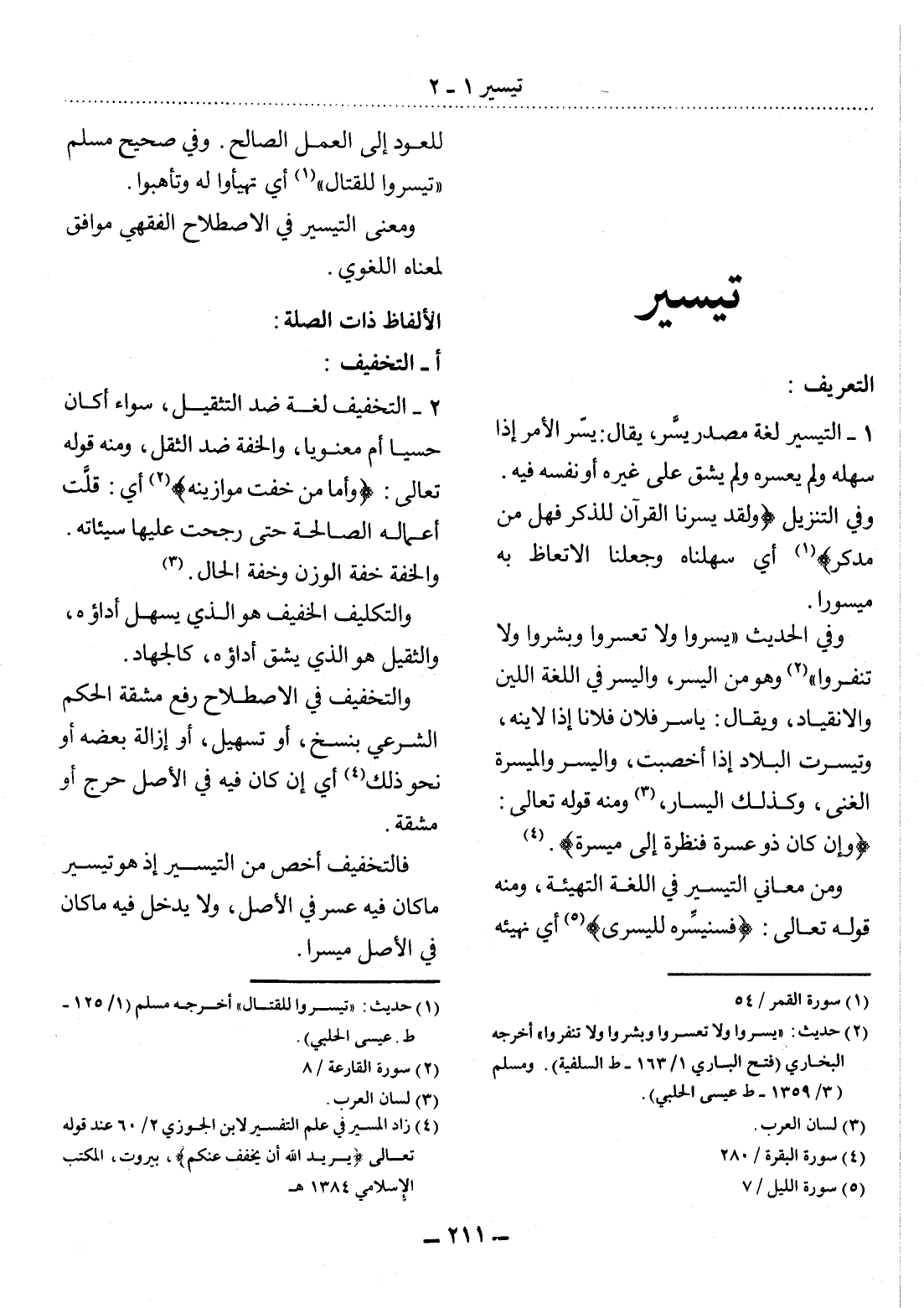 1 - التَّيْسِيرُ لُغَةً مَصْدَرُ يَسَّرَ، يُقَال: يَسَّرَ الأَْمْرَ إِذَا سَهَّلَهُ وَلَمْ يُعَسِّرْهُ وَلَمْ يَشُقَّ عَلَى غَيْرِهِ أَوْ نَفْسِهِ فِيهِ. وَفِي التَّنْزِيل {وَلَقَدْ يَسَّرْنَا الْقُرْآنَ لِلذِّكْرِ فَهَل مِنْ مُدَّكِرٍ} (1) أَيْ سَهَّلْنَاهُ وَجَعَلْنَا الاِتِّعَاظَ بِهِ مَيْسُورًا.