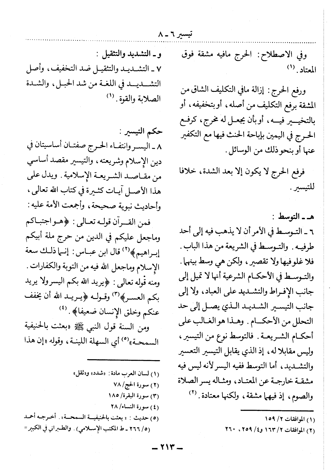 8 - الْيُسْرُ وَانْتِفَاءُ الْحَرَجِ صِفَتَانِ أَسَاسِيَّتَانِ فِي دِينِ الإِْسْلاَمِ وَشَرِيعَتِهِ، وَالتَّيْسِيرُ مَقْصِدٌ أَسَاسِيٌّ مِنْ مَقَاصِدِ الشَّرِيعَةِ الإِْسْلاَمِيَّةِ. وَيَدُل عَلَى هَذَا الأَْصْل آيَاتٌ كَثِيرَةٌ فِي كِتَابِ اللَّهِ تَعَالَى، وَأَحَادِيثُ نَبَوِيَّةٌ صَحِيحَةٌ، وَأَجْمَعَتِ الأُْمَّةُ عَلَيْهِ: