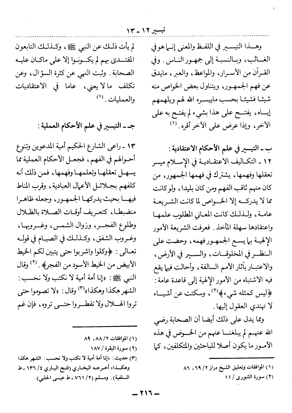 12 - التَّكَالِيفُ الاِعْتِقَادِيَّةُ فِي الإِْسْلاَمِ مُيَسَّرٌ تَعَقُّلُهَا وَفَهْمُهَا، يَشْتَرِكُ فِي فَهْمِهَا الْجُمْهُورُ، مَنْ كَانَ مِنْهُمْ ثَاقِبَ الْفَهْمِ وَمَنْ كَانَ بَلِيدًا، وَلَوْ كَانَتْ مِمَّا لاَ يُدْرِكُهُ إِلاَّ الْخَوَاصُّ لَمَا كَانَتِ الشَّرِيعَةُ عَامَّةً؛ وَلِذَلِكَ كَانَتِ الْمَعَانِي الْمَطْلُوبُ عِلْمُهَا وَاعْتِقَادُهَا سَهْلَةَ الْمَأْخَذِ. فَعَرَّفَتِ الشَّرِيعَةُ الأُْمُورَ الإِْلَهِيَّةَ بِمَا يَسَعُ الْجُمْهُورَ فَهْمُهُ، وَحَضَّتْ عَلَى النَّظَرِ فِي الْمَخْلُوقَاتِ، وَالسَّيْرِ فِي الأَْرْضِ، وَالاِعْتِبَارِ بِآثَارِ الأُْمَمِ السَّالِفَةِ، وَأَحَالَتْ فِيمَا يَقَعُ فِيهِ الاِشْتِبَاهُ مِنَ الأُْمُورِ الإِْلَهِيَّةِ إِلَى قَاعِدَةٍ عَامَّةٍ: {لَيْسَ كَمِثْلِهِ شَيْءٌ} (2) ، وَسَكَتَتْ عَنْ أَشْيَاءَ لاَ تَهْتَدِي الْعُقُول إِلَيْهَا.