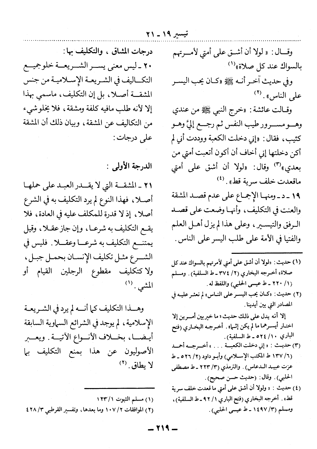 20 - لَيْسَ مَعْنَى يُسْرِ الشَّرِيعَةِ خُلُوُّ جَمِيعِ التَّكَالِيفِ فِي الشَّرِيعَةِ الإِْسْلاَمِيَّةِ مِنْ جِنْسِ الْمَشَقَّةِ أَصْلاً، بَل إِنَّ التَّكْلِيفَ، مَا سُمِّيَ بِهَذَا إِلاَّ لأَِنَّهُ طَلَبُ مَا فِيهِ كُلْفَةٌ وَمَشَقَّةٌ، فَلاَ يَخْلُو شَيْءٌ مِنَ التَّكَالِيفِ عَنِ الْمَشَقَّةِ، وَبَيَانُ ذَلِكَ أَنَّ الْمَشَقَّةَ عَلَى دَرَجَاتٍ: