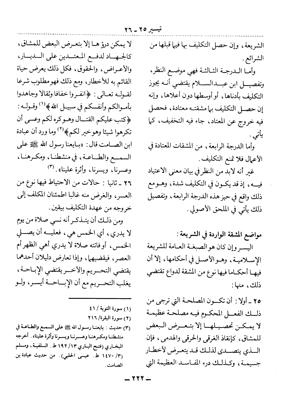 25 - أَوَّلاً: أَنْ تَكُونَ الْمَصْلَحَةُ الَّتِي تُرْجَى مِنْ ذَلِكَ الْفِعْل الْمَحْكُومِ فِيهِ مَصْلَحَةً عَظِيمَةً لاَ يُمْكِنُ تَحْصِيلُهَا إِلاَّ بِتَعَرُّضِ الْبَعْضِ لِلْمَشَاقِّ، كَإِنْقَاذِ الْغَرْقَى وَالْحَرْقَى وَالْهَدْمَى، فَإِنَّ الَّذِي يَتَصَدَّى لِذَلِكَ قَدْ يَتَعَرَّضُ لأَِخْطَارٍ جَسِيمَةٍ، وَكَذَلِكَ دَرْءُ الْمَفَاسِدِ الْعَظِيمَةِ الَّتِي