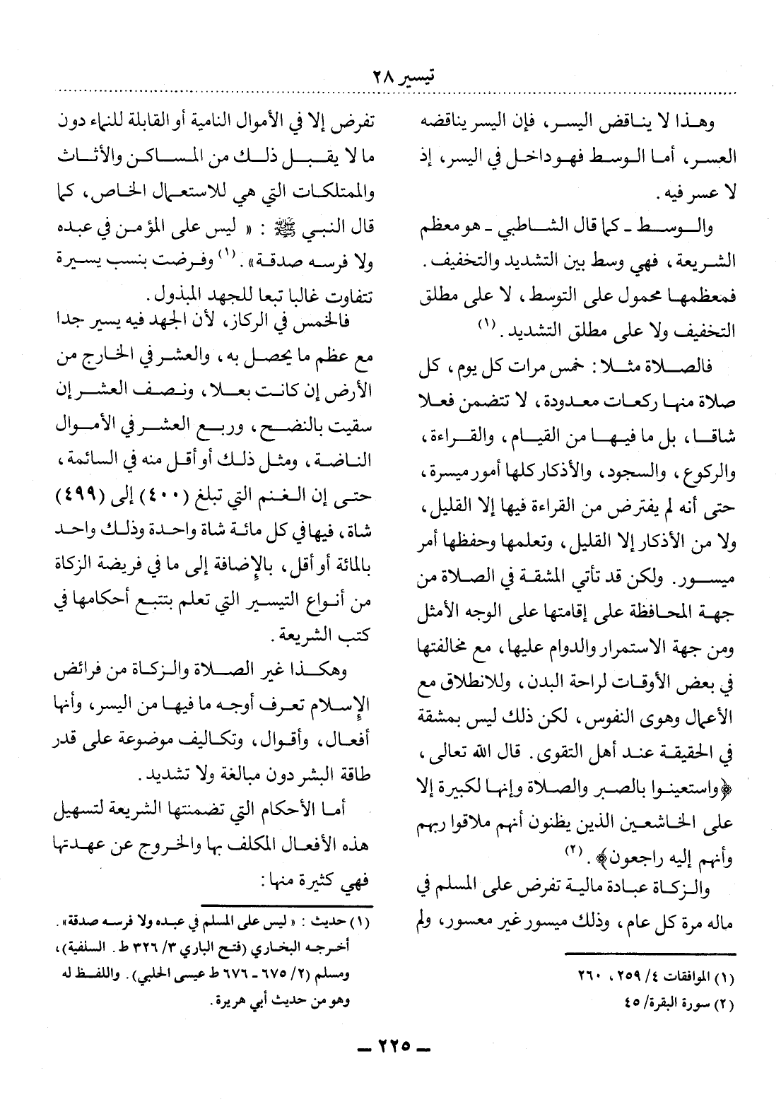 وَهَكَذَا غَيْرُ الصَّلاَةِ وَالزَّكَاةِ مِنْ فَرَائِضِ الإِْسْلاَمِ تُعْرَفُ أَوْجُهَ مَا فِيهَا مِنَ الْيُسْرِ، وَأَنَّهَا أَفْعَالٌ، وَأَقْوَالٌ، وَتَكَالِيفُ مَوْضُوعَةٌ عَلَى قَدْرِ طَاقَةِ الْبَشَرِ دُونَ مُبَالَغَةٍ وَلاَ تَشْدِيدٍ.