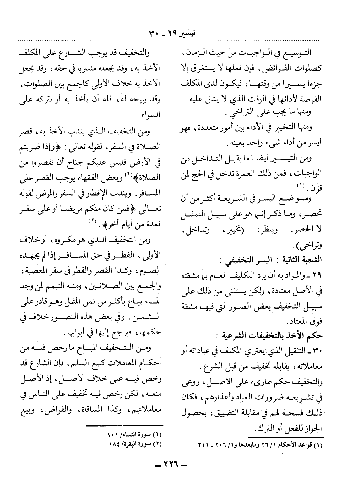 30 - التَّثْقِيل الَّذِي يَعْتَرِي الْمُكَلَّفَ فِي عِبَادَاتِهِ أَوْ مُعَامَلاَتِهِ، يُقَابِلُهُ تَخْفِيفٌ مِنْ قِبَل الشَّرْعِ.