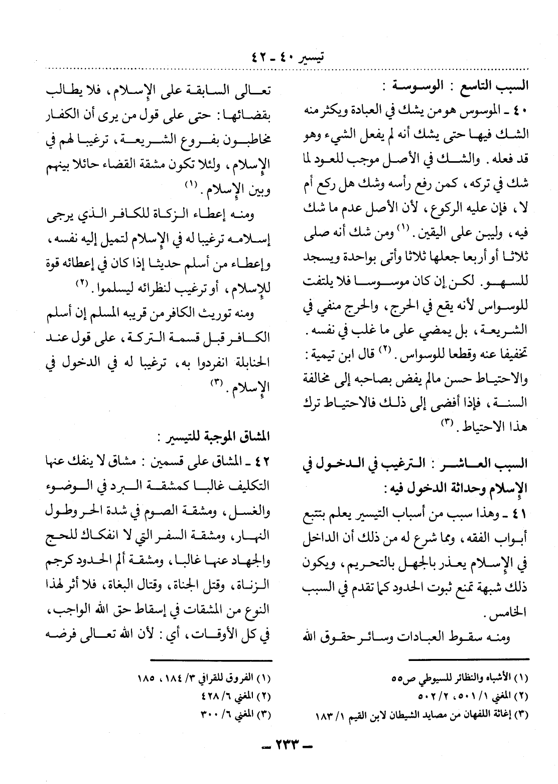 41 - وَهَذَا سَبَبٌ مِنْ أَسْبَابِ التَّيْسِيرِ يُعْلَمُ بِتَتَبُّعِ أَبْوَابِ الْفِقْهِ، وَمِمَّا شُرِعَ لَهُ مِنْ ذَلِكَ أَنَّ الدَّاخِل فِي الإِْسْلاَمِ يُعْذَرُ بِالْجَهْل بِالتَّحْرِيمِ، وَيَكُونُ ذَلِكَ شُبْهَةً تَمْنَعُ ثُبُوتَ الْحُدُودِ كَمَا تَقَدَّمَ فِي السَّبَبِ الْخَامِسِ.