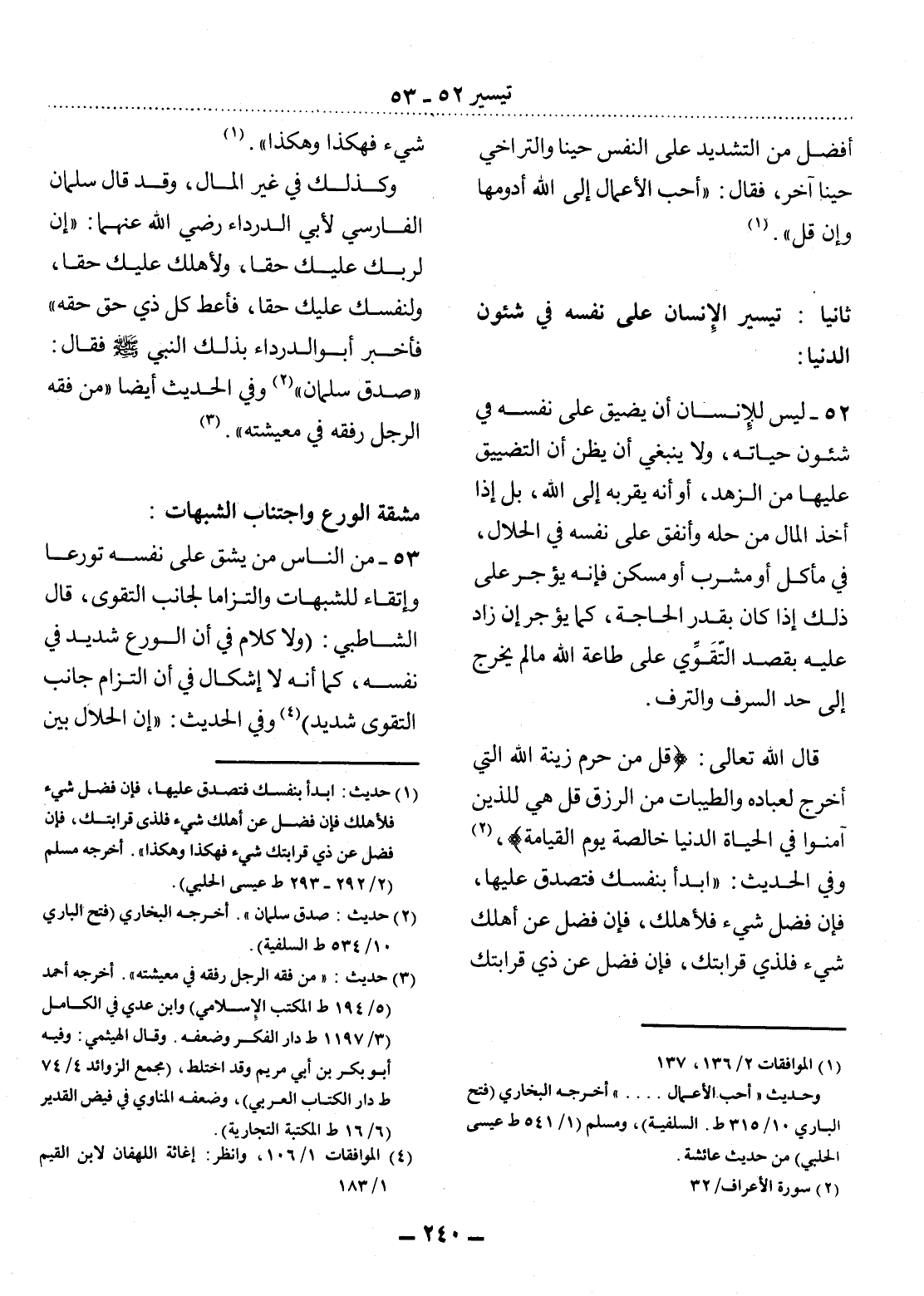52 - لَيْسَ لِلإِْنْسَانِ أَنْ يُضَيِّقَ عَلَى نَفْسِهِ فِي شُؤُونِ حَيَاتِهِ، وَلاَ يَنْبَغِي أَنْ يَظُنَّ أَنَّ التَّضْيِيقَ عَلَيْهَا مِنَ الزُّهْدِ، أَوْ أَنَّهُ يُقَرِّبُهُ إِلَى اللَّهِ، بَل إِذَا أَخَذَ الْمَال مِنْ حِلِّهِ وَأَنْفَقَ عَلَى نَفْسِهِ فِي الْحَلاَل، فِي مَأْكَلٍ أَوْ مَشْرَبٍ أَوْ مَسْكَنٍ فَإِنَّهُ يُؤْجَرُ عَلَى ذَلِكَ إِذَا كَانَ بِقَدْرِ الْحَاجَةِ، كَمَا يُؤْجَرُ إِنْ زَادَ عَلَيْهِ بِقَصْدِ التَّقَوِّي عَلَى طَاعَةِ اللَّهِ مَا لَمْ يَخْرُجْ إِلَى حَدِّ السَّرَفِ وَالتَّرَفِ.