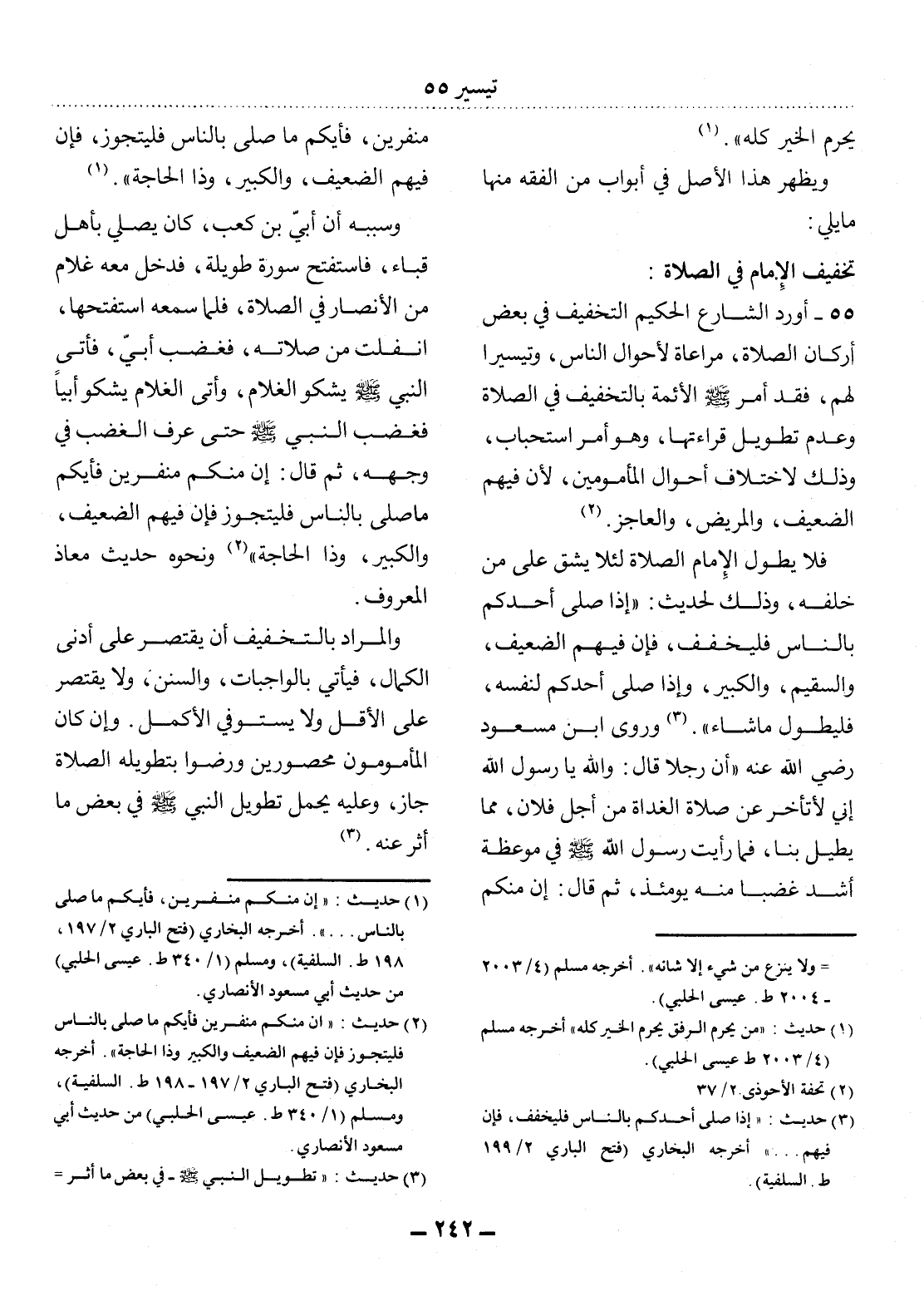 (1) حديث: " إن منكم منفرين، فأيكم ما صلى بالناس. . . . " أخرجه البخاري (فتح الباري 2 / 197، 198ط. السلفية) ، ومسلم (1 / 340 ط. عيسى الحلبي) من حديث أبي مسعود الأنصاري.