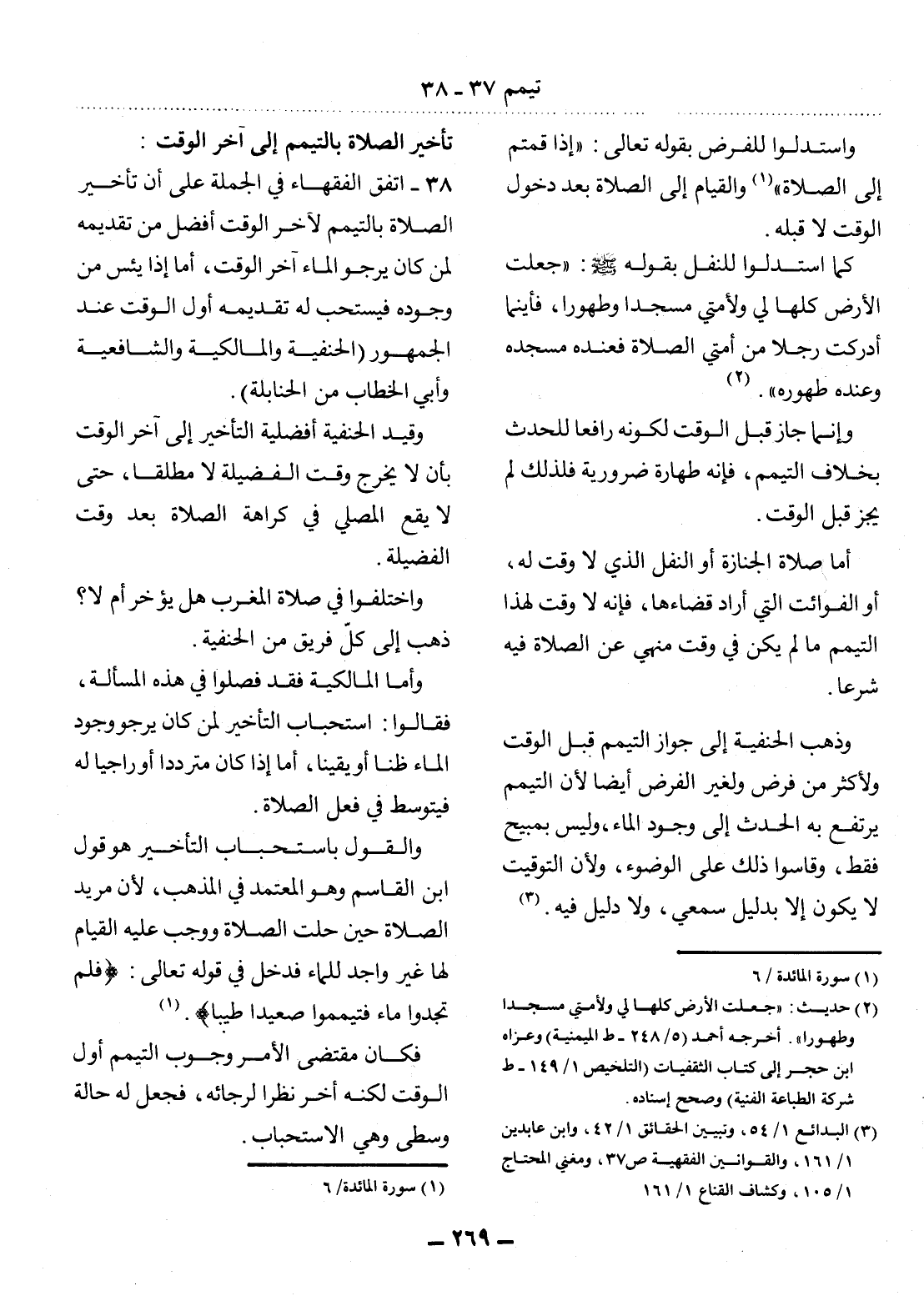 38 - اتَّفَقَ الْفُقَهَاءُ فِي الْجُمْلَةِ عَلَى أَنَّ تَأْخِيرَ الصَّلاَةِ بِالتَّيَمُّمِ لآِخِرِ الْوَقْتِ أَفْضَل مِنْ تَقْدِيمِهِ لِمَنْ كَانَ يَرْجُو الْمَاءَ آخِرَ الْوَقْتِ، أَمَّا إِذَا يَئِسَ مِنْ وُجُودِهِ فَيُسْتَحَبُّ لَهُ تَقْدِيمُهُ أَوَّل الْوَقْتِ عِنْدَ الْجُمْهُورِ (الْحَنَفِيَّةُ وَالْمَالِكِيَّةُ وَالشَّافِعِيَّةُ وَأَبِي الْخَطَّابِ مِنَ الْحَنَابِلَةِ) .