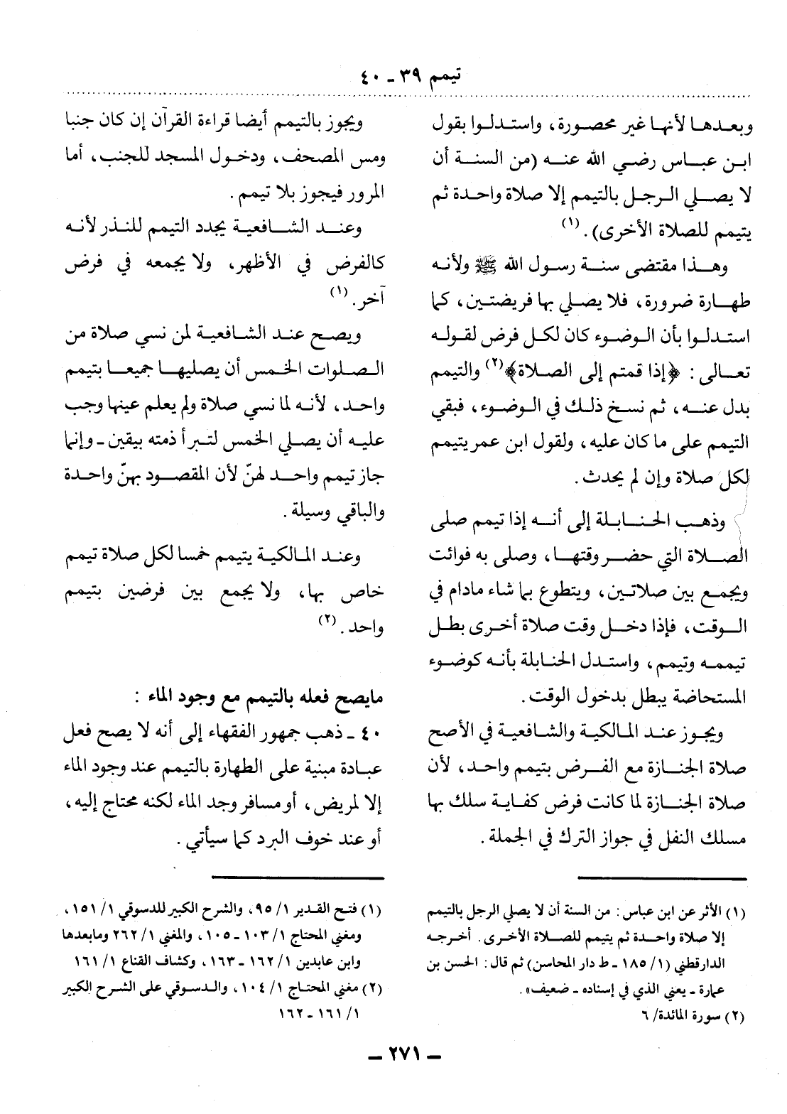 40 - ذَهَبَ جُمْهُورُ الْفُقَهَاءِ إِلَى أَنَّهُ لاَ يَصِحُّ فِعْل عِبَادَةٍ مَبْنِيَّةٍ عَلَى الطَّهَارَةِ بِالتَّيَمُّمِ عِنْدَ وُجُودِ الْمَاءِ إِلاَّ لِمَرِيضٍ، أَوْ مُسَافِرٍ وَجَدَ الْمَاءَ لَكِنَّهُ مُحْتَاجٌ إِلَيْهِ، أَوْ عِنْدَ خَوْفِ الْبَرْدِ كَمَا سَيَأْتِي.