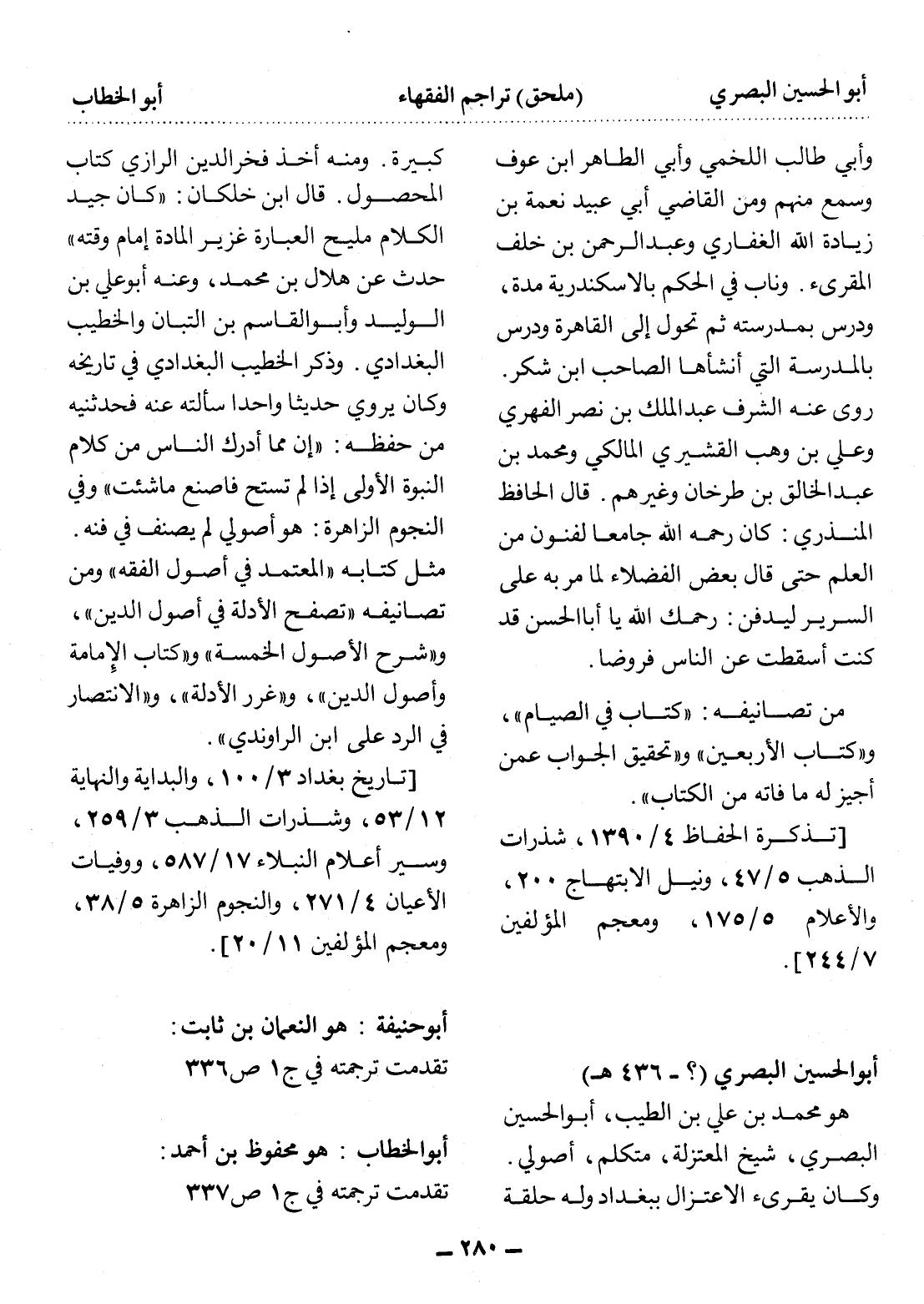 كبيرة. ومنه أخذ فخر الدين الرازي كتاب المحصول. قال ابن خلكان: " كان جيد الكلام مليح العبارة غزير المادة إمام وقته " حدث عن هلال بن محمد، وعنه أبو علي بن الوليد وأبو القاسم بن التبان والخطيب البغدادي. وذكر الخطيب البغدادي في تاريخه وكان يروي حديثا واحدا سألته عنه فحدثنيه من حفظه: " إن مما أدرك الناس من كلام النبوة الأولى إذا لم تستح فاصنع ما شئت " وفي النجوم الزاهرة: هو أصولي لم يصنف في فنه. مثل كتابه " المعتمد في أصول الفقه " ومن تصانيفه " تصفح الأدلة في أصول الدين "، و " شرح الأصول الخمسة " و " كتاب الإمامة وأصول الدين "، و " غرر الأدلة "، و " الانتصار في الرد على ابن الراونيد ". [تاريخ بغداد 3 / 100، والبداية والنهاية 12 / 53، وشذرات الذهب 3 / 259، وسير أعلام النبلاء 17 / 587، ووفيات الأعيان 4 / 271، والنجوم الزاهرة 5 / 38، ومعجم المؤلفين 1120] .