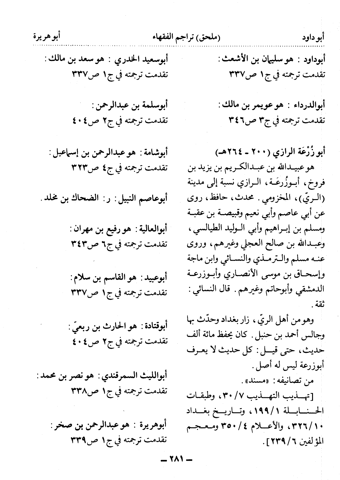 هو عبيد الله بن عبد الكريم بن يزيد بن فروخ، أبو زُرعَة، الرازي نسبة إلى مدينة (الري) ، المخزومي. محدث، حافظ، روى عن أبي عاصم وأبي نعيم وقبيصة بن عقبة ومسلم بن إبراهيم وأبي الوليد الطيالسي، وعبد الله بن صالح العجلي وغيرهم، وروى عنه مسلم والترمذي والنسائي وابن ماجه وإسحاق بن موسى الأنصاري وأبو زرعة الدمشقي وأبو حاتم وغيرهم. قال النسائي: ثقة. وهو من أهل الريّ، زار بغداد وحدث بها وجالس أحمد بن حنبل. كان يحفظ مائة ألف حديث، حتى قيل: كل حديث لا يعرف أبو زرعة ليس له أصل. من تصانيفه: " مسند ". [تهذيب التهذيب 7 / 30، وطبقات الحنابلة 1 / 199، وتاريخ بغداد 10 / 326، والأعلام 4 / 350 ومعجم المؤلفين 6 / 239] .